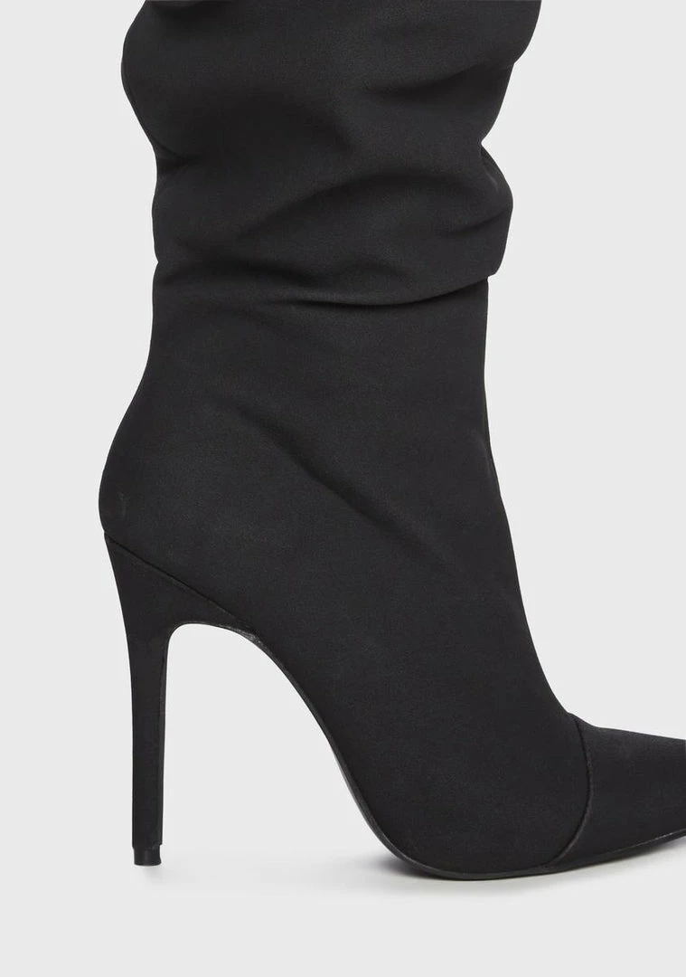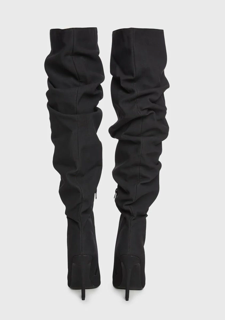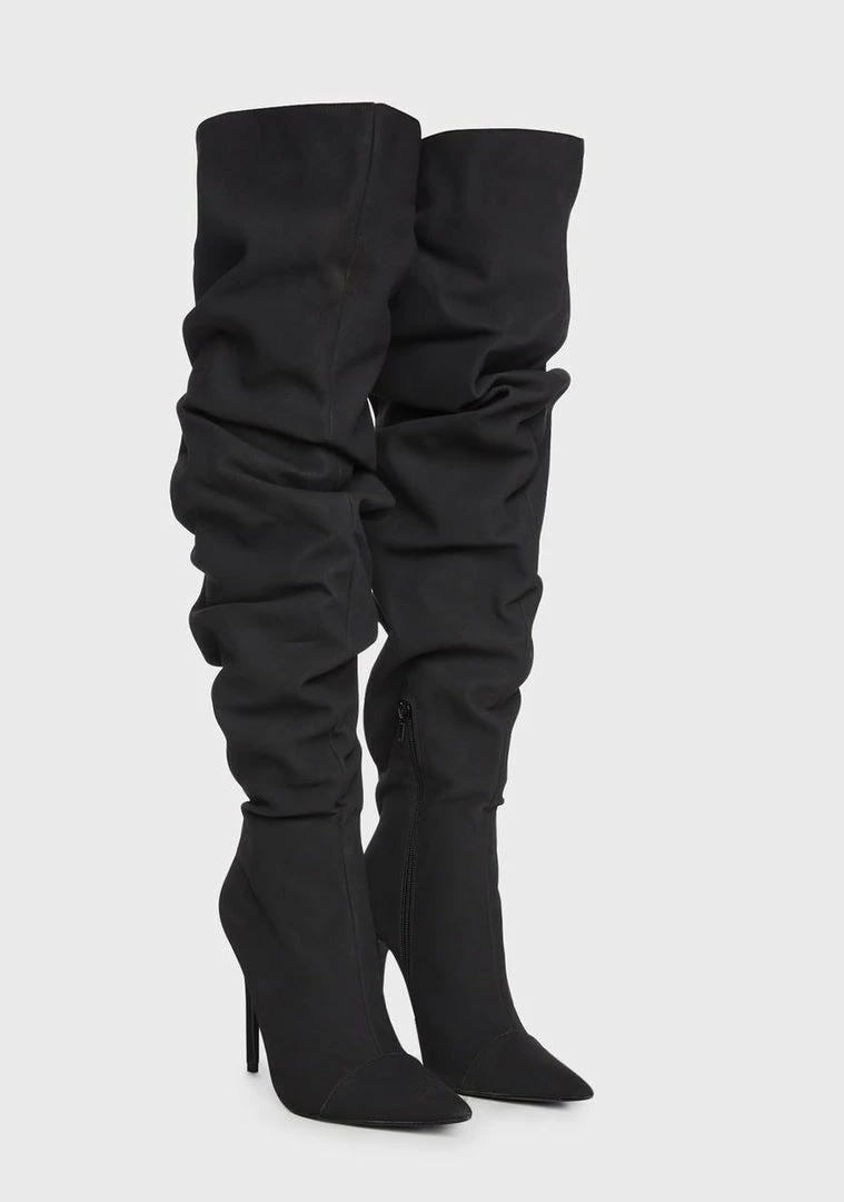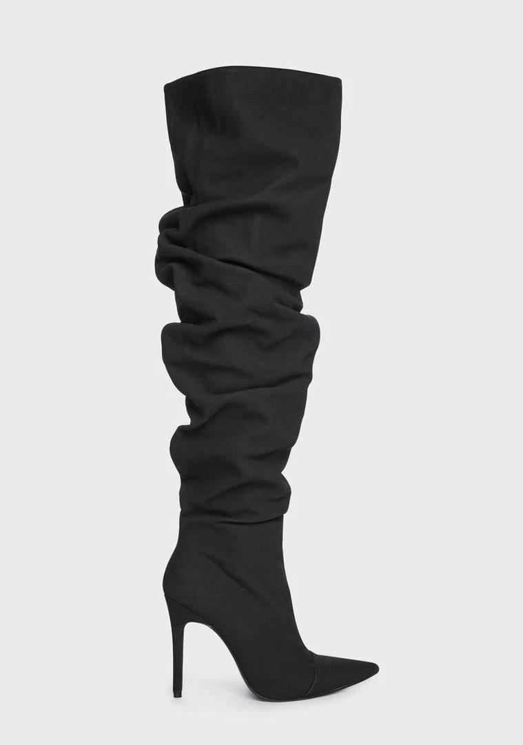 cuz you’re worth the while. These boots come in a faux suede slouch construction, with a pointed toe, stiletto heel, and inner zip closure.
