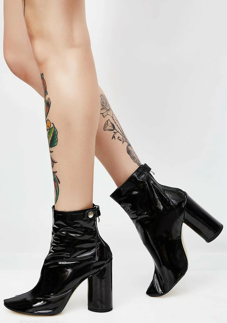 will have ya walkinâ all over tha haterz. These sikkk vinyl block heels are sexy and shiny with a back zip closure and snap button detail.