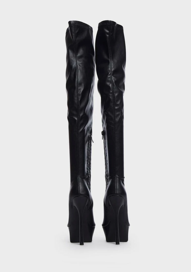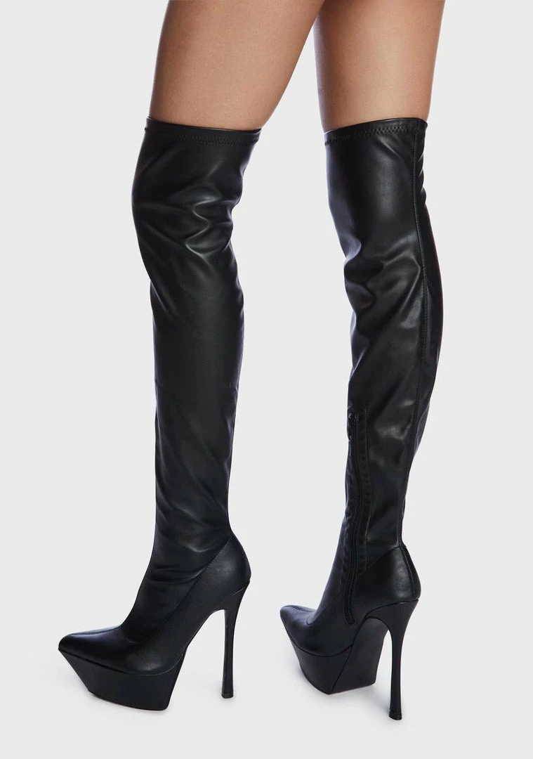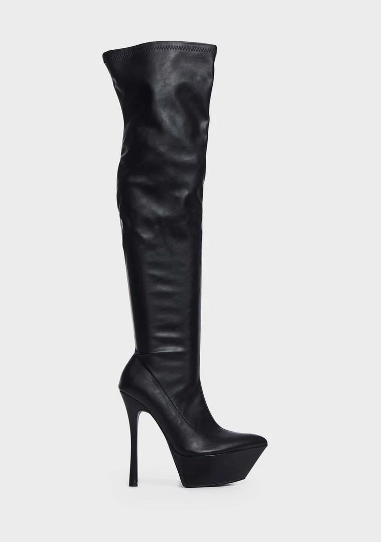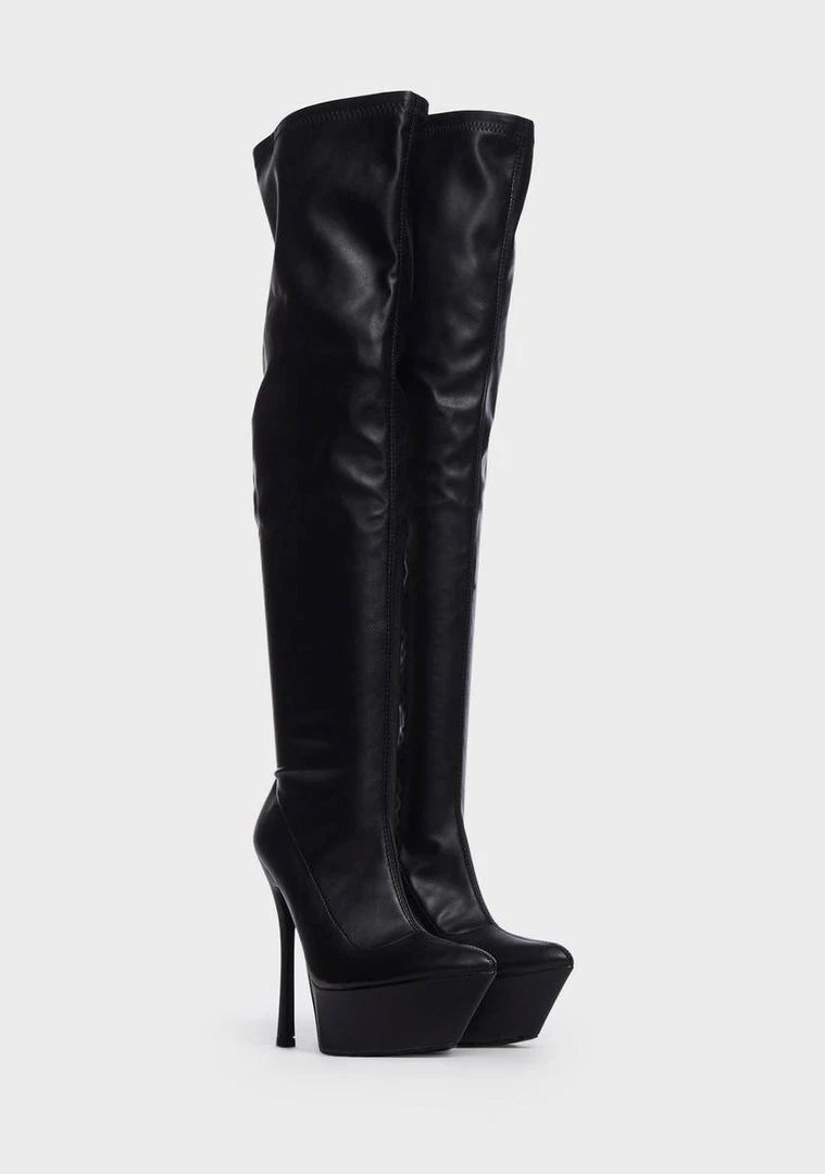 cuz you’ve got your ways. These boots come in a knee high matte vegan leather construction, with a platform stiletto heel, pointed toe, and inner zip closure.