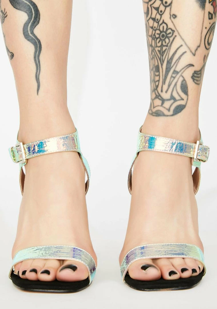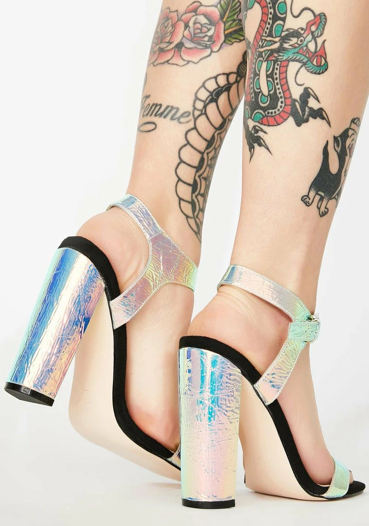 yer lookinΓ’ΒΒ fresh off another planet, bb. Channel the stars in these strappy heels that have an iridescent construction, peep toe, block heels, and buckle closures.