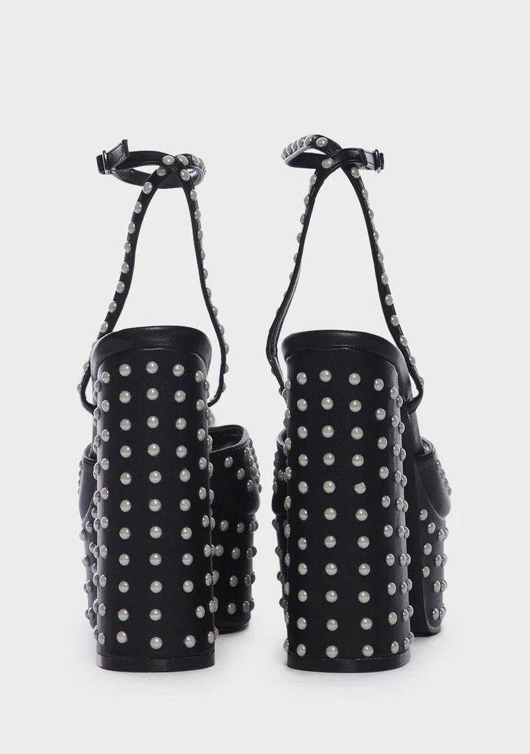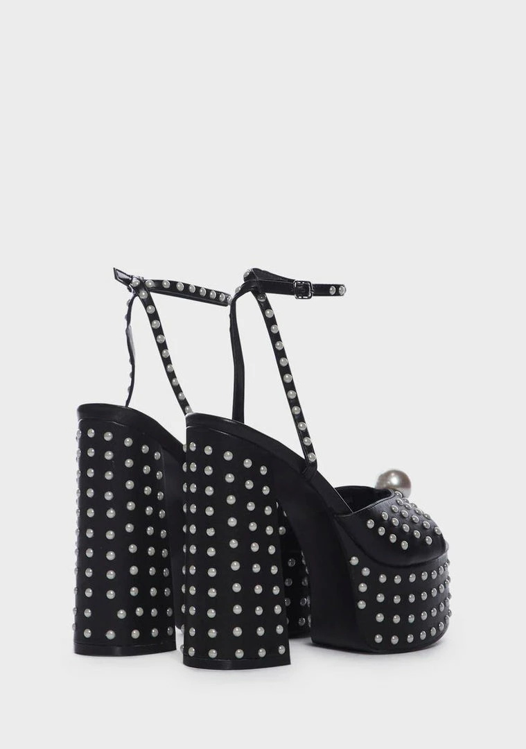 cuz you’re all class. These platform heels have a satin construction, pearl embellishments all over, adjustable buckled ankle straps, and slightly-flared block heels.