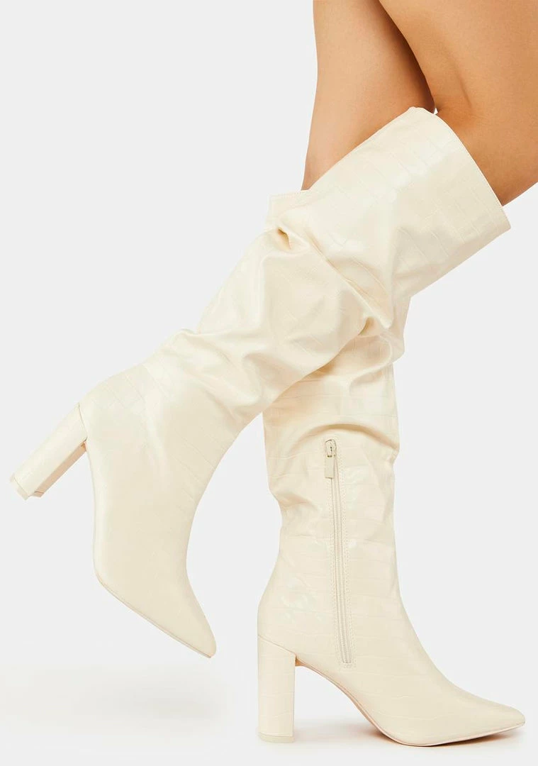 cuz finders keepers. These boots have a vegan leather construction, a crocodile pattern, ruched detailing, pointed toes, block heels, and side zipper closures.