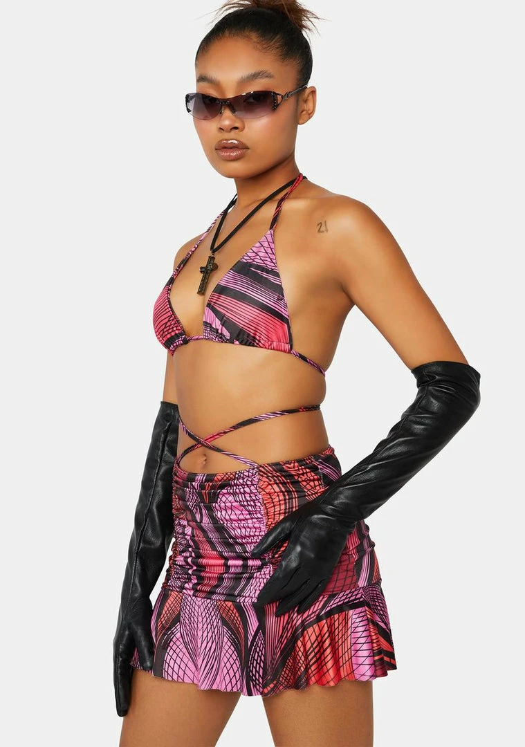 cuz you’re out of this world! This high-waisted mini skirt has a futuristic abstract print all over, adjustable lace-up waist ties, a ruched construction, and a ruffled hem.