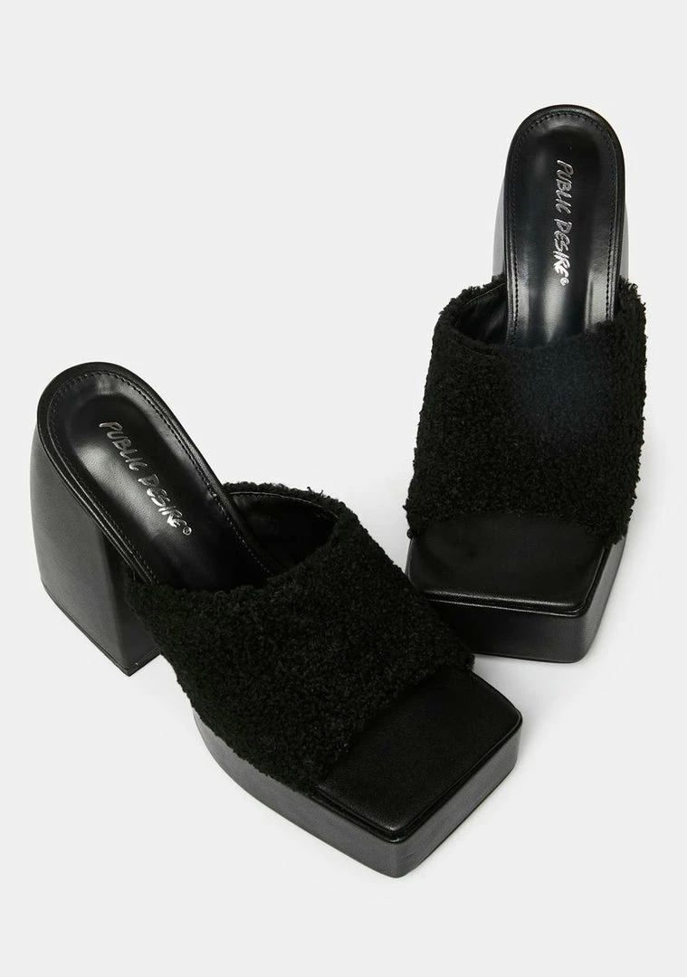 wear what you love! These heeled mules have a vegan leather construction, faux shearling vamp straps, chunky platforms, and curved block heels.