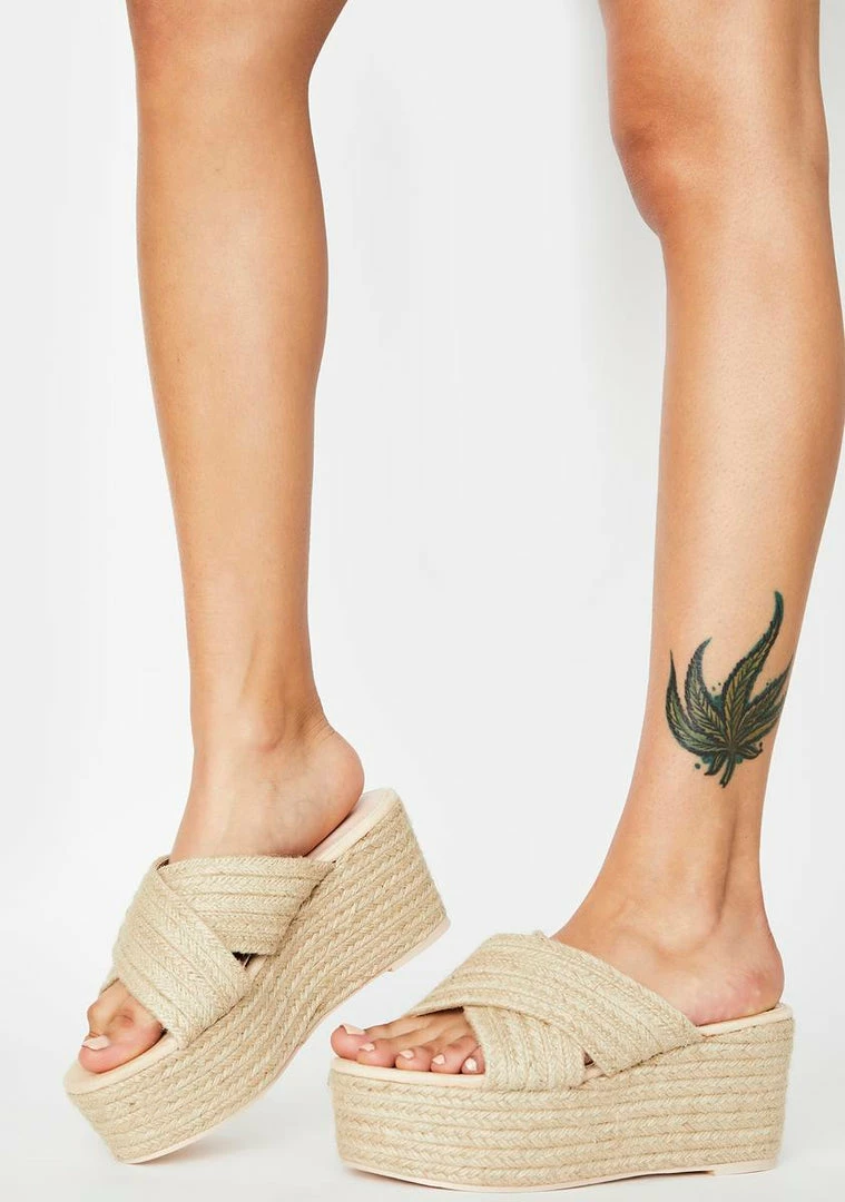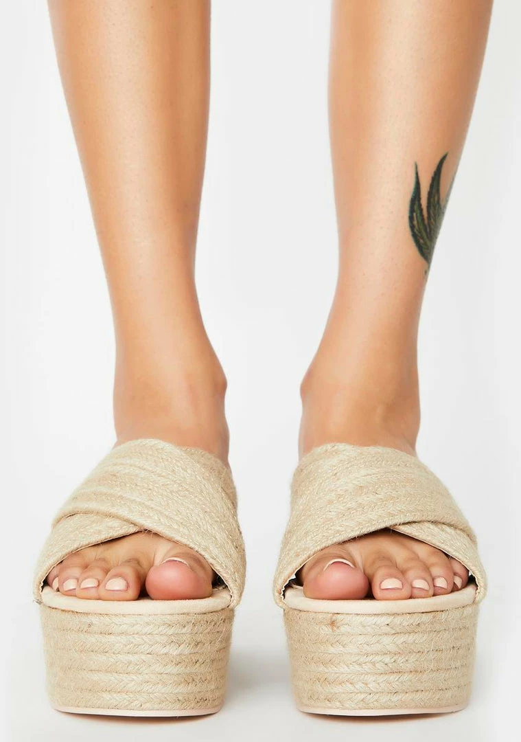 gotcha flowinΓ’ΒΒ like the island wind. Sneak off to paradise in these supa cute slide sandals that have a braided wicker construction with thicc platforms, crossover straps and open toes.