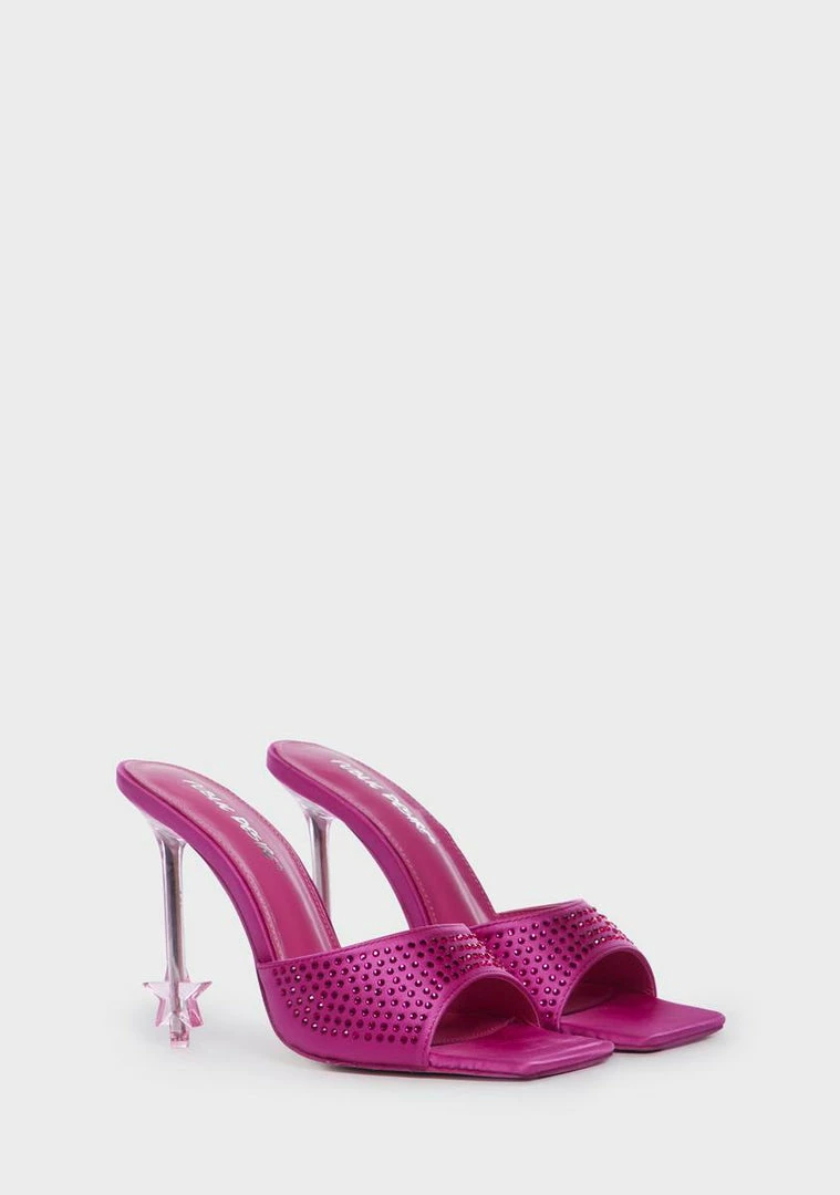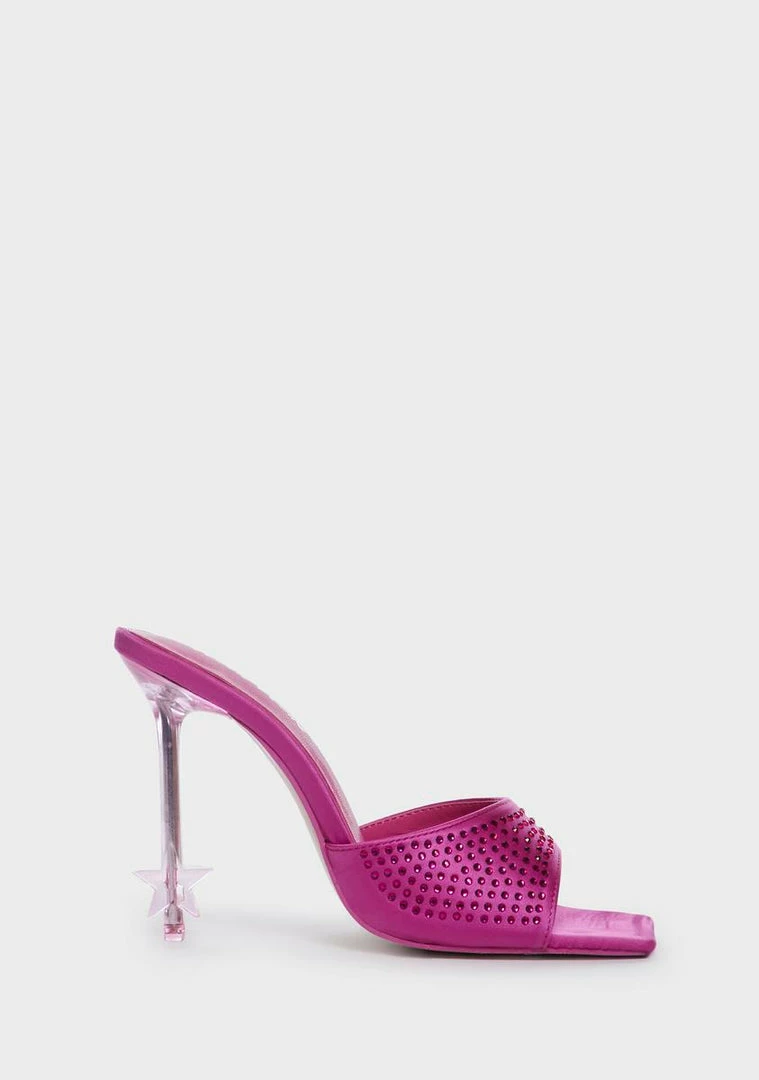 cuz they gotta love you. These heels come in a satin construction, with a square open toe, rhinestone details, and a clear heel with a star detail.