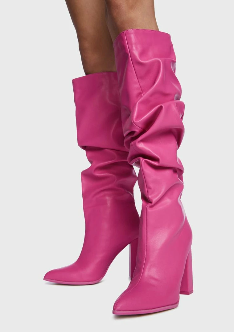 cuz double down. These boots have a vegan leather construction, a slouchy design, pointed toes, block heels, and a pull on fit.