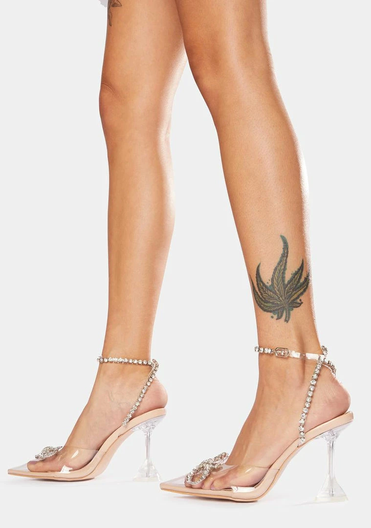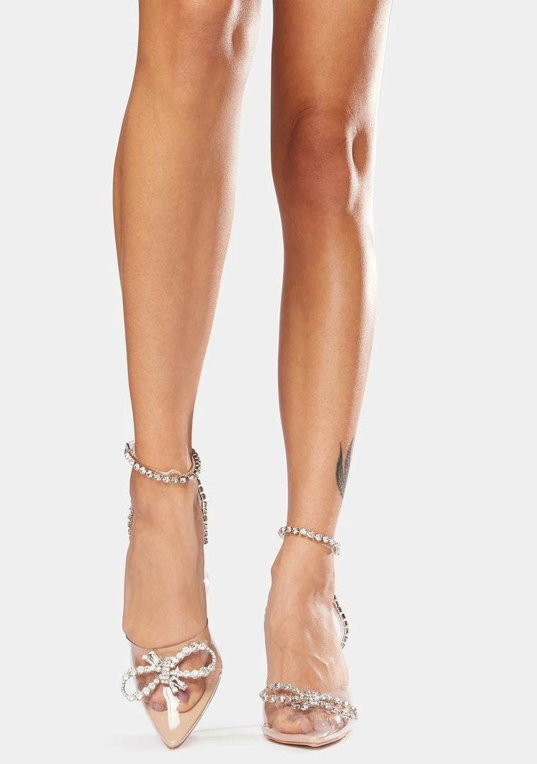 youΓ’ΒΒre the belle of the ball in this glamorous pointed toe heels that feature rhinestone crisscross ankle straps, low pyramid heels, and diamante bow accents.