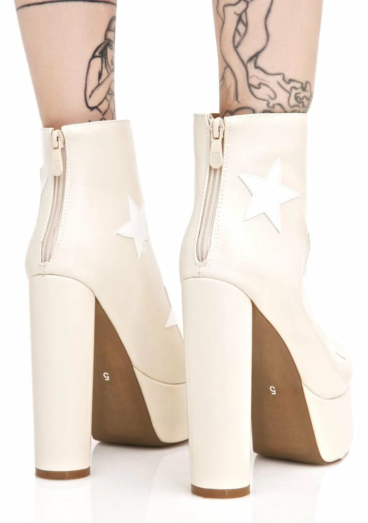 …ground control to mars, weâre callinâ for you! These ultra cool boots feature a smooth nude vegan leather construction, supa tall covered platform âN block heel, white star appliques all over, and back zip closure.
