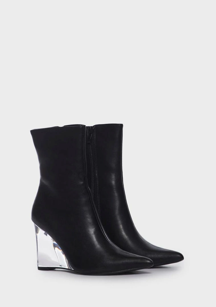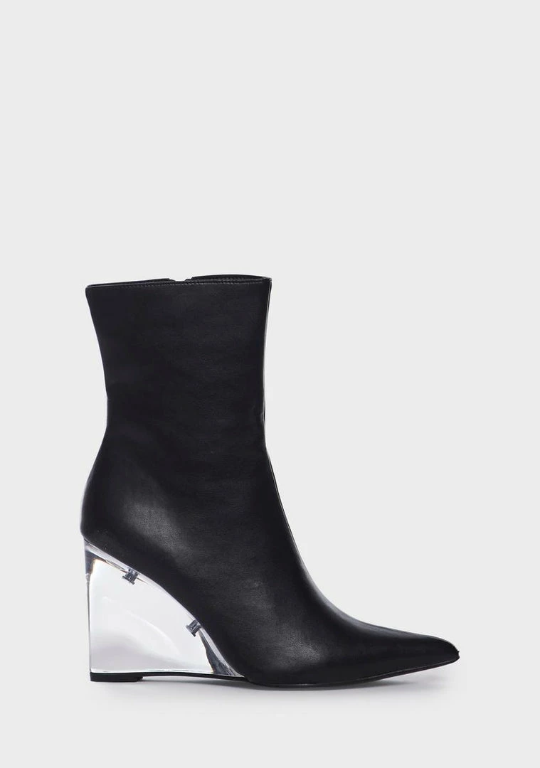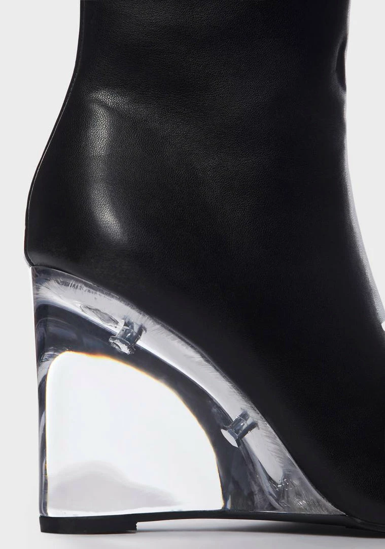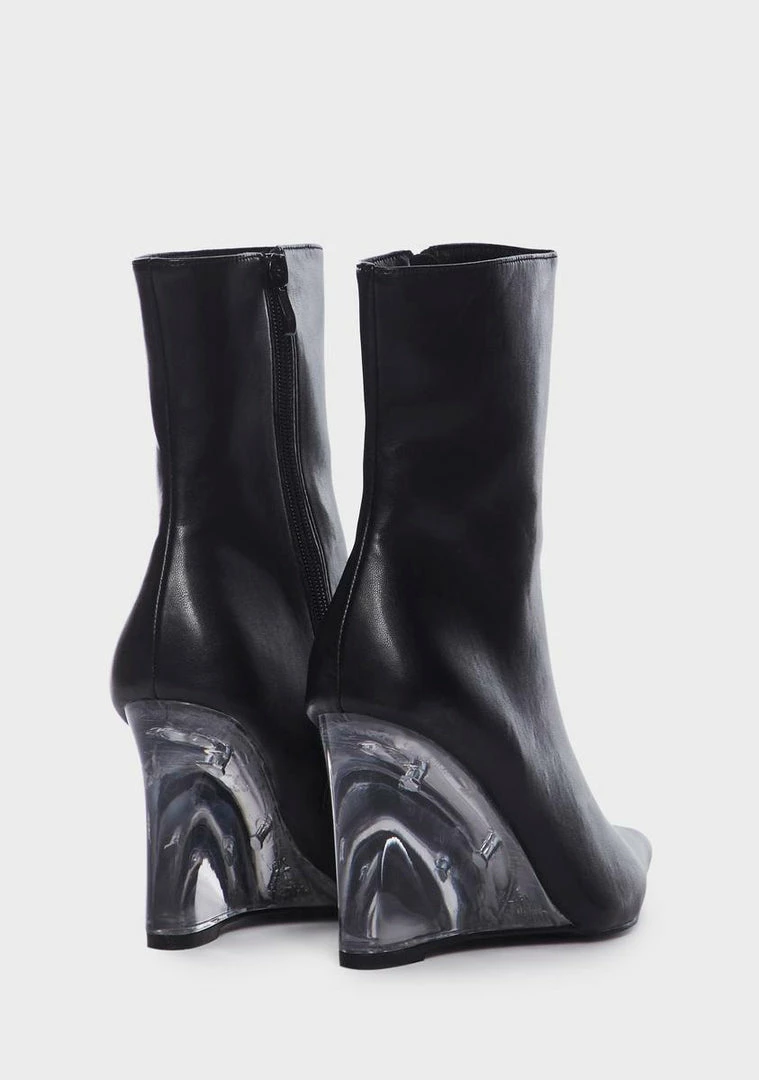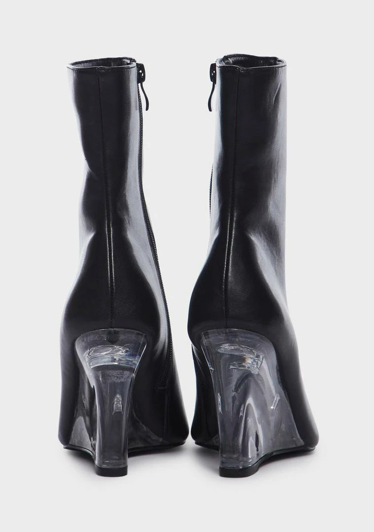 cuz make a statement. These boots have a vegan leather construction, a pointed toe design, clear heels, and side zipper closures.