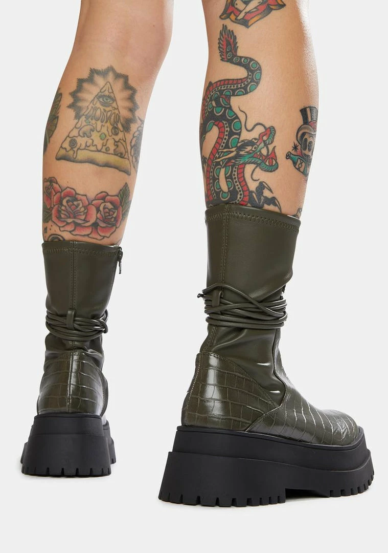 stomp out the competition in these chunky ankle boots that feature a crocodile embossed vegan leather construction with wrap accents, treaded platform soles, and side zip closures.