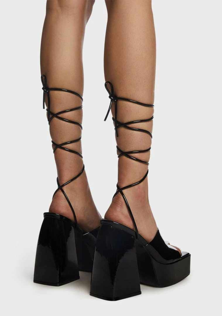 cuz you’re truly something special! These platform heels have a patent vegan leather construction, adjustable lace-up ties, and slightly-flared block heels.