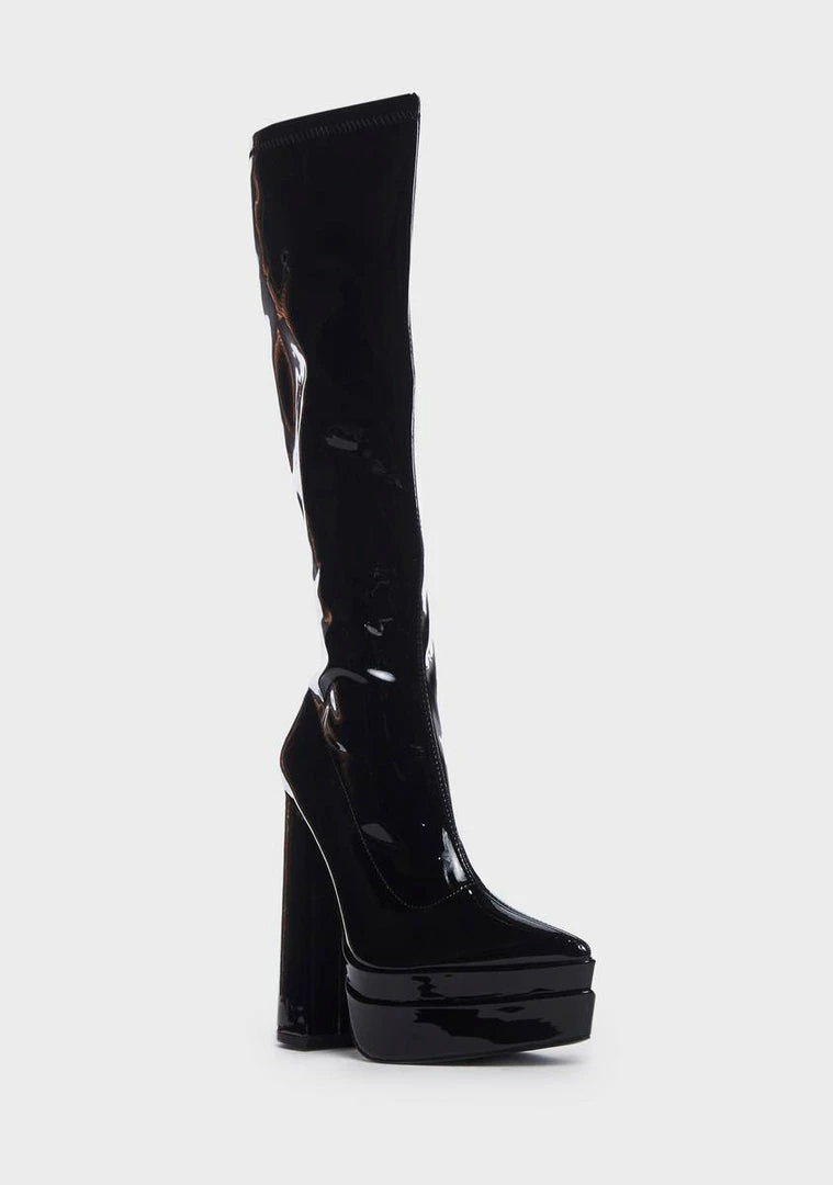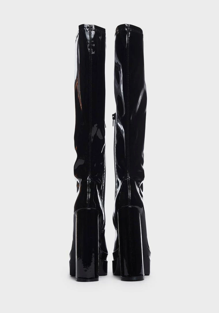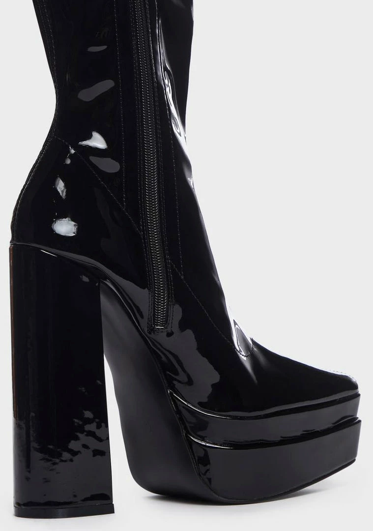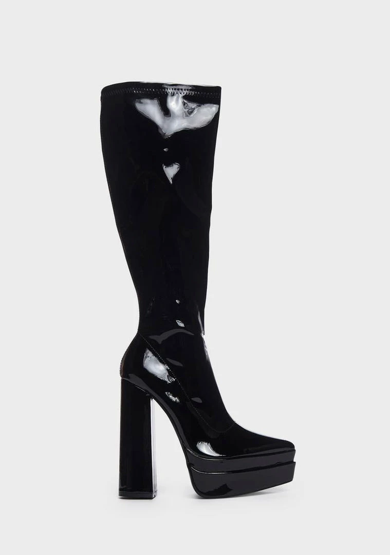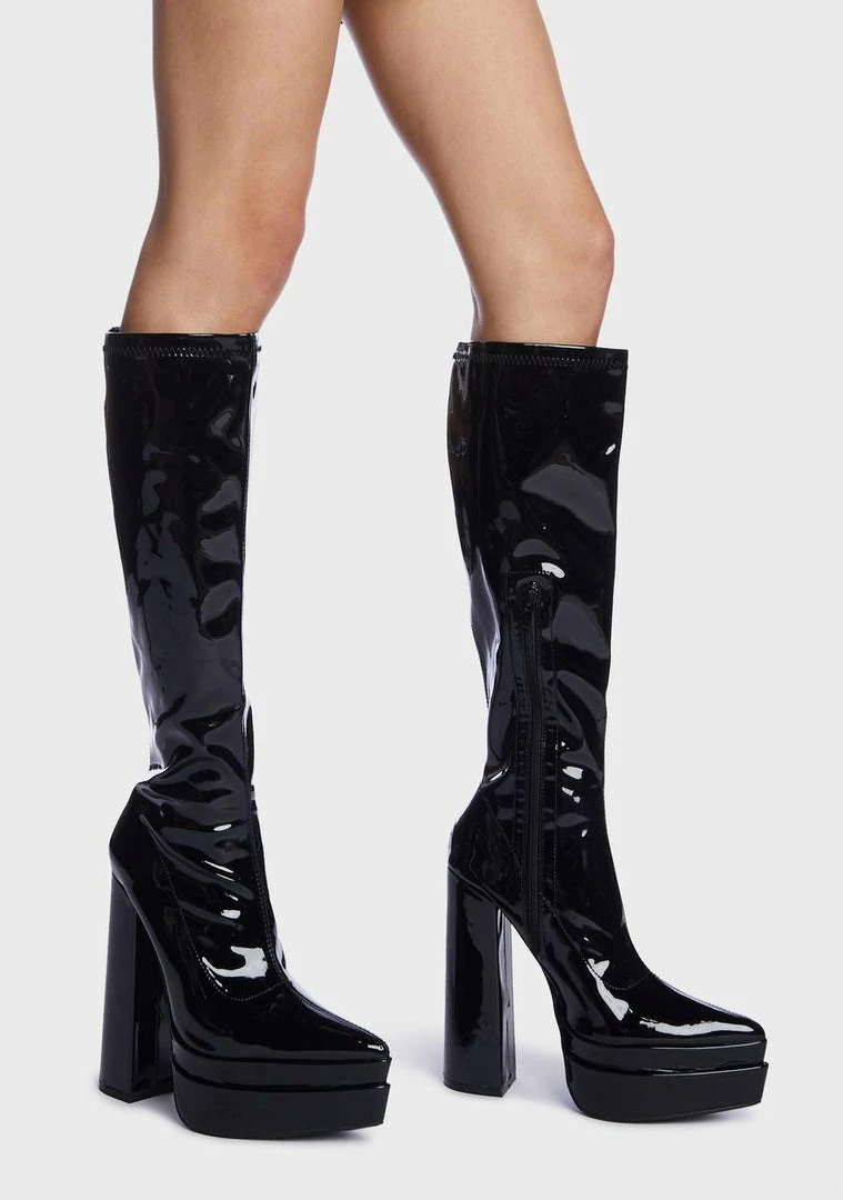are this season’s must-have shoes. These knee-high boots have a patent vegan leather construction, pointed toes, side zip closures, double-stacked platforms, and tall block heels.