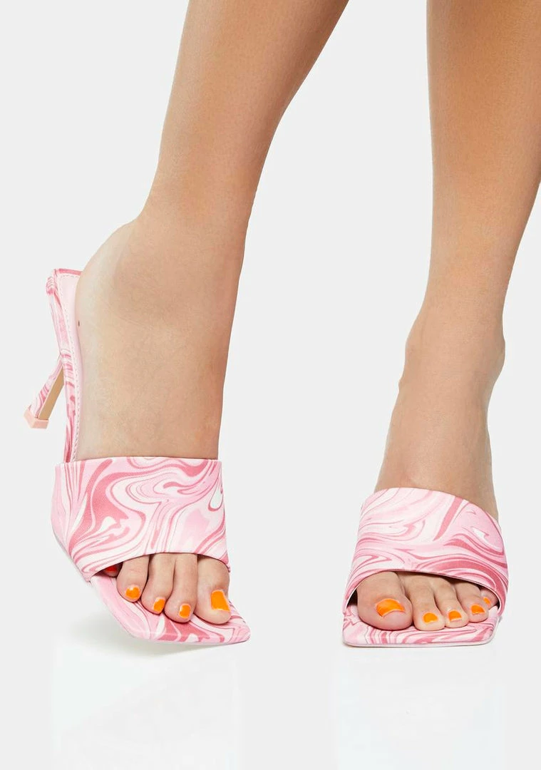 cuz they can’t look away. These mules come in a vegan leather construction, with a heel, squared toe, foot strap, and swirl print all over.