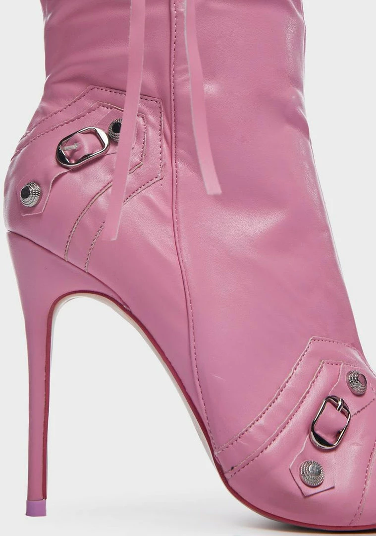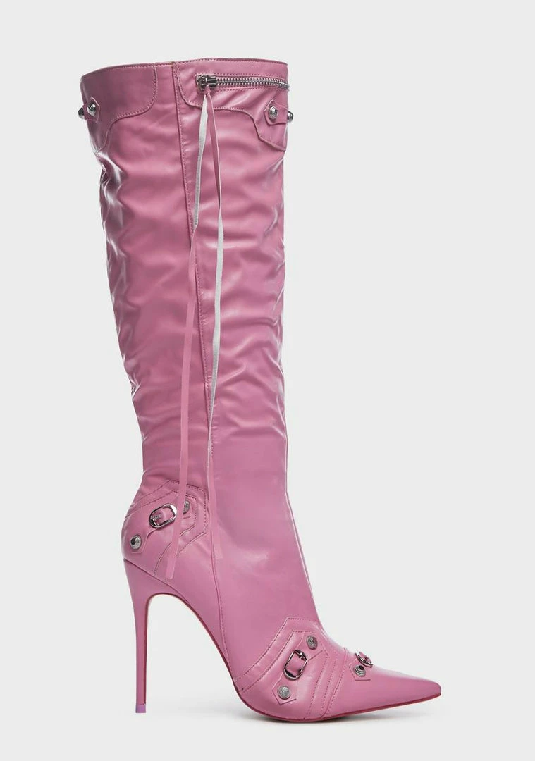 cuz you couldn’t mess with me even if you wanted to. These boots come in a vegan leather construction, with a stiletto heel, stud and buckle details, a decorative zipper detail, and an inner zip closure.