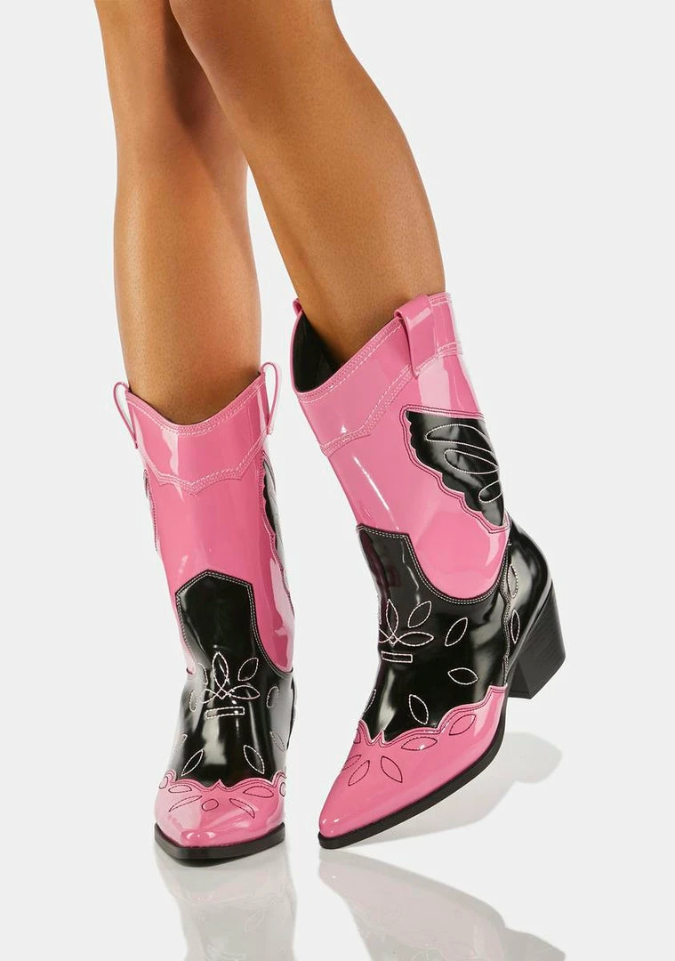 you’re the new sheriff in town! These cowboy boots have a two-tone vegan leather construction with a patent finish, western embroidered designs, side pull tabs, and stacked heels.