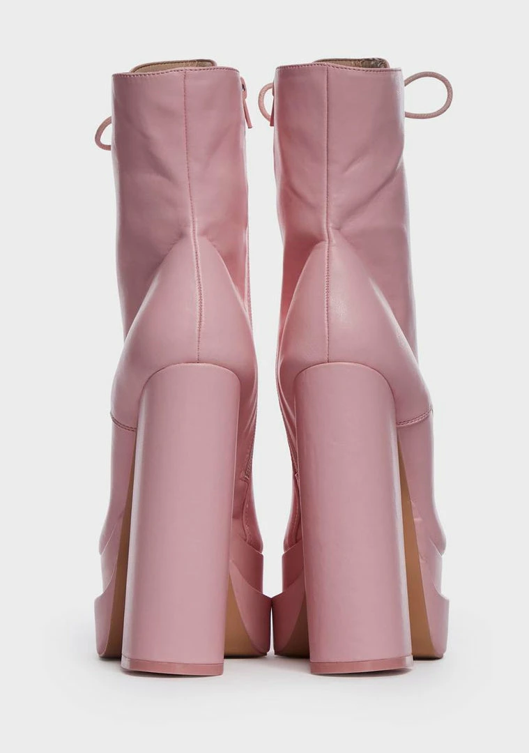 cuz stayin’ grounded is overrated. These boots have a vegan leather construction, platform soles, block heels, front lace ups, and side zipper closures.