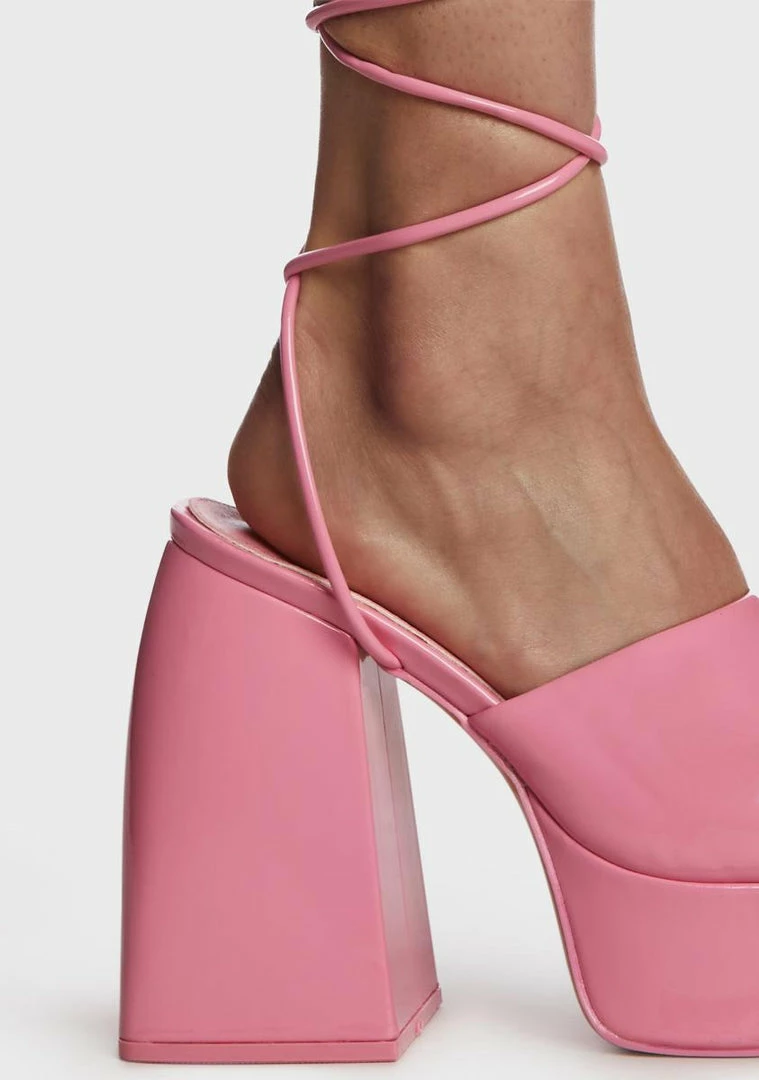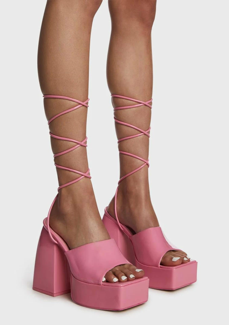 cuz you’re truly something special! These platform heels have a patent vegan leather construction, adjustable lace-up ties, and slightly-flared block heels.