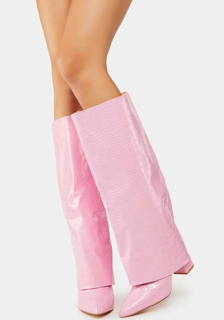 cuz you’re taking the world by storm. These boots come in a vegan leather croc construction, knee high length, with a pointed toe, square heel, and a folded shaft design.