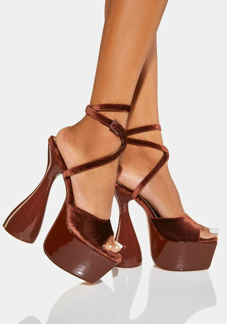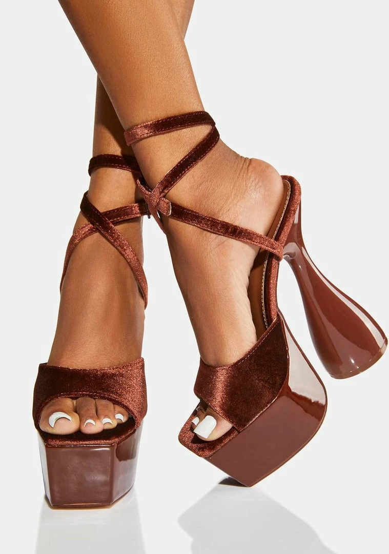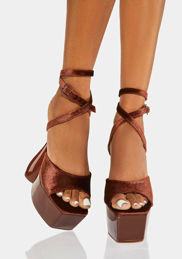 cuz you’re down to boogie. Dance the night away in these lace up heels that have a velvet construction, peep toes, platform heels, and an ankle strap with buckle closures.