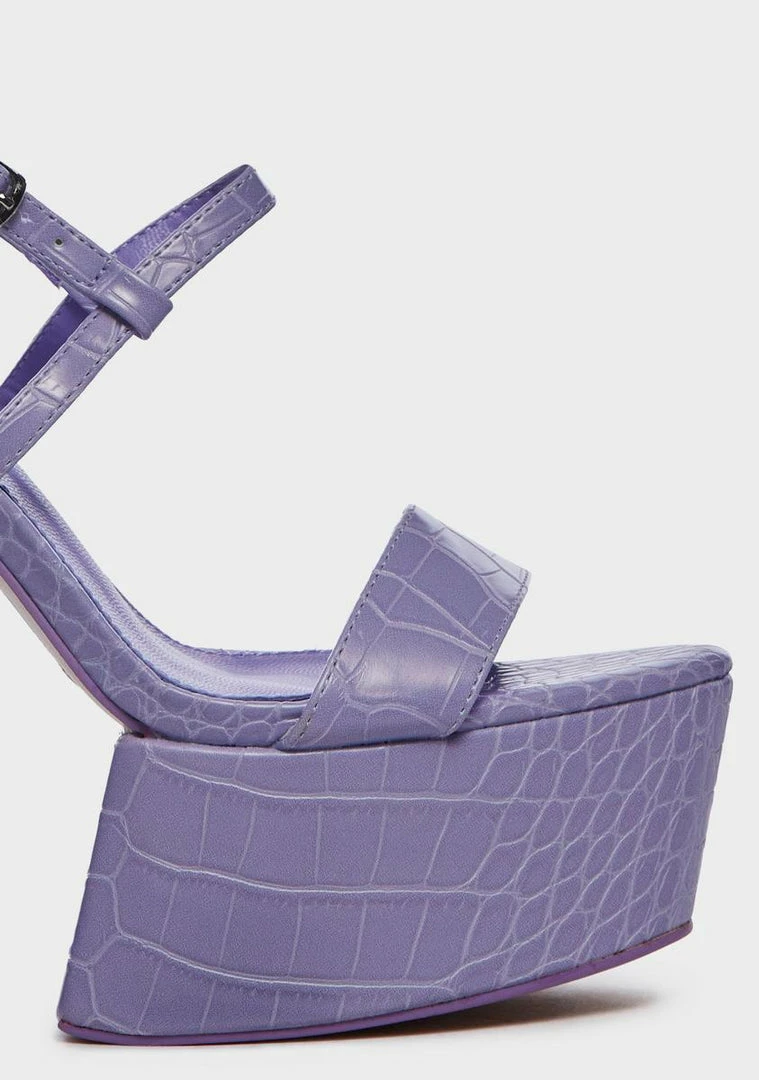 cuz you have arrived. These platform heels have a vegan leather construction, a crocodile pattern, platform soles, block heels, and adjustable ankle buckle straps.