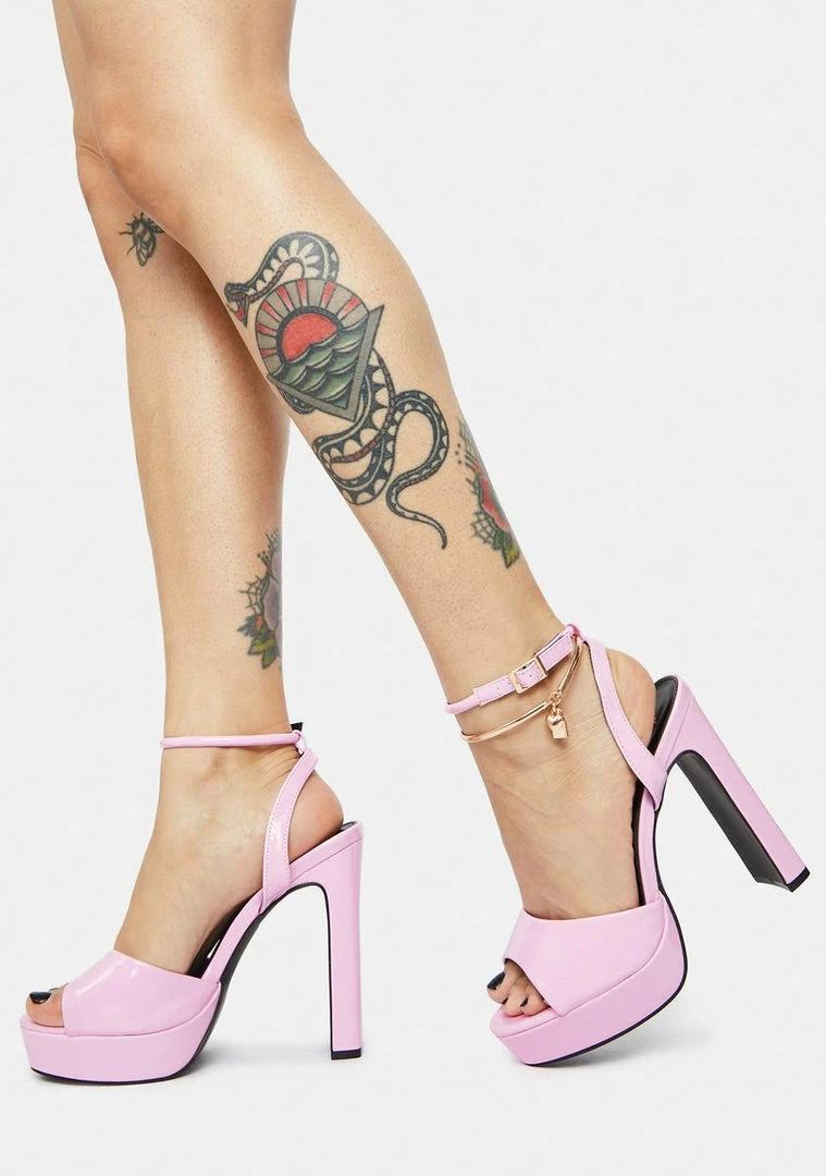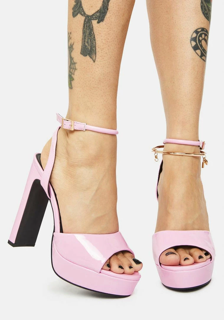 feature a chunky heel, peep toe construction, patent vegan leather fabric design, and buckle closure at the ankle.