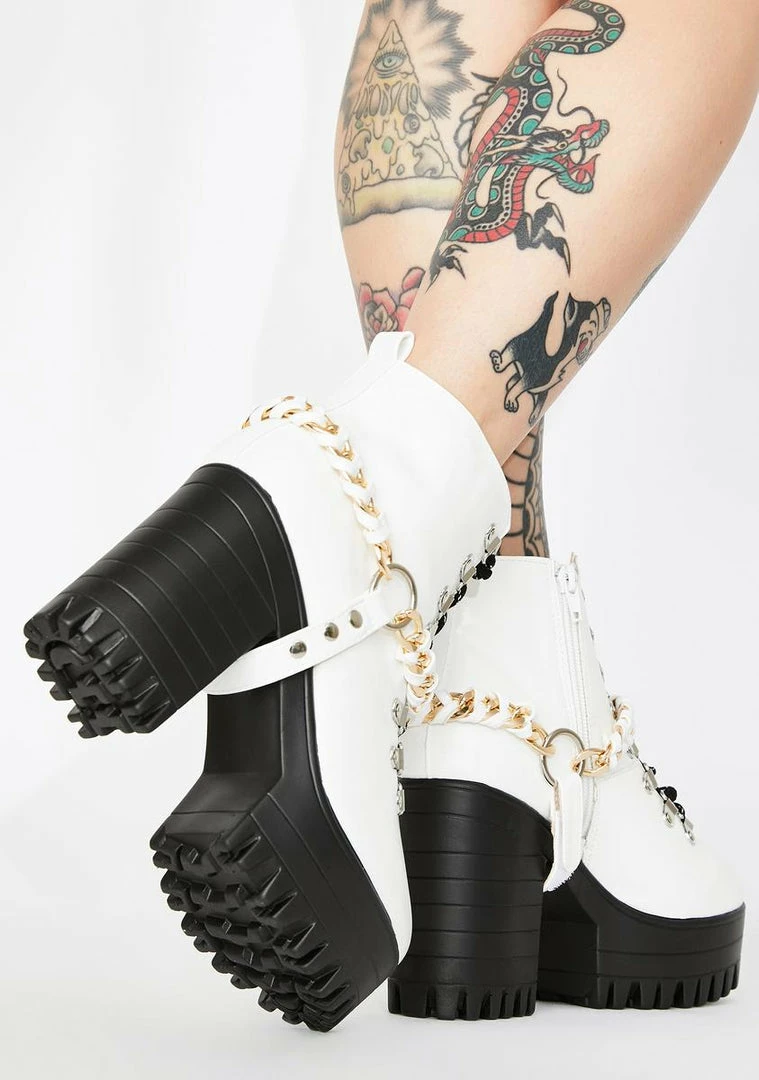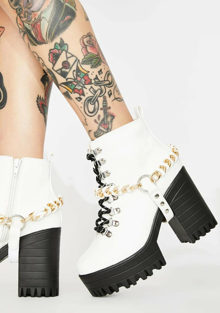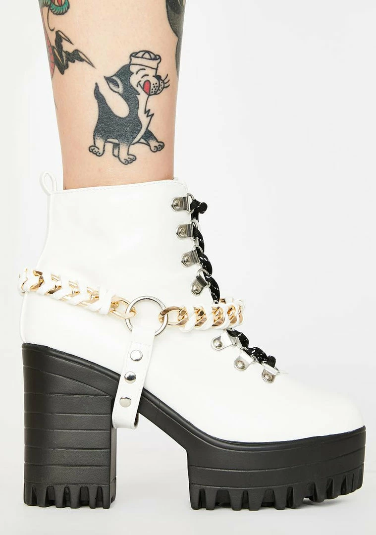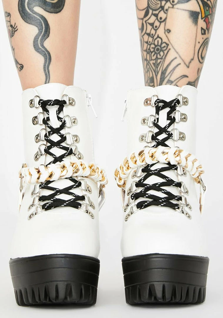 ya didnรขยยt know you need it until now, bb. These boots are a want AND a need with gold chain hardware, black hiker laces, and a chunky treaded sole.