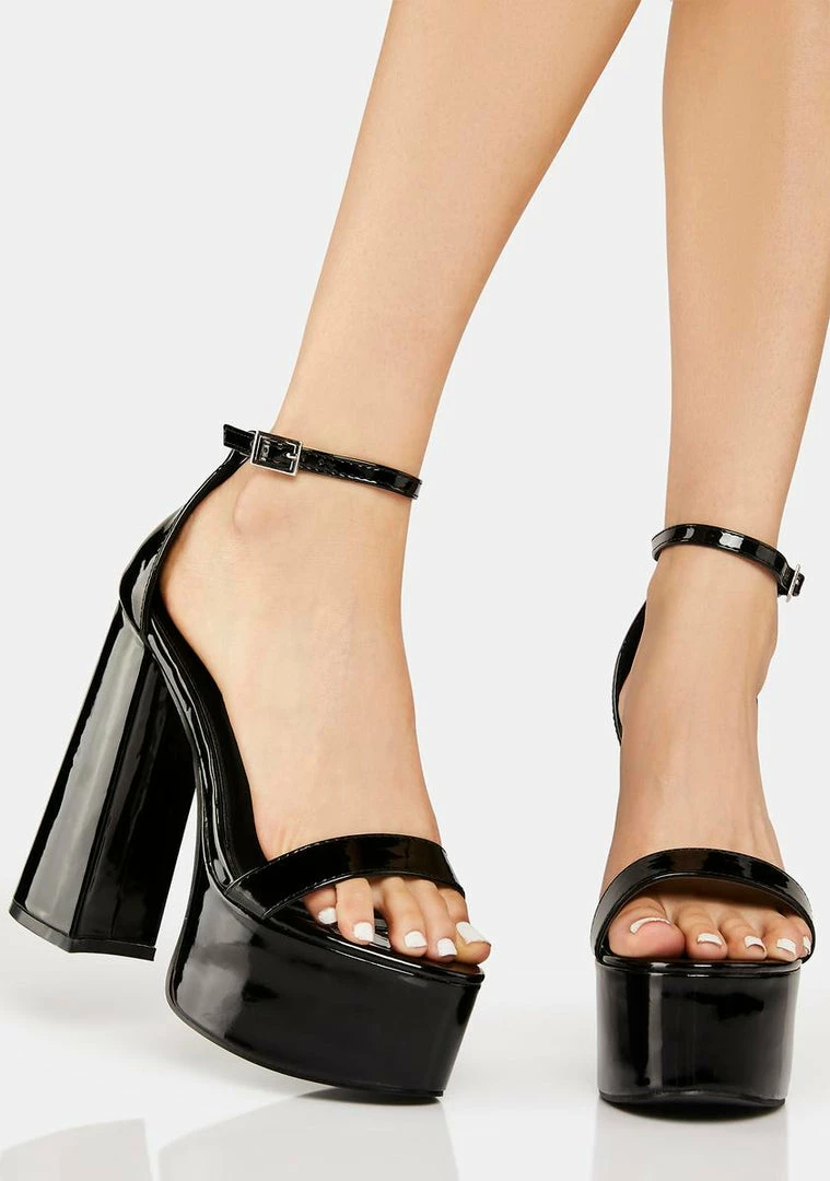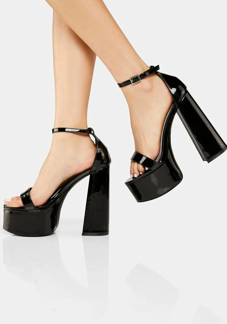 cuz you’re hittin’ new heights! These platform heels have a glossy patent vegan leather construction, single vamp straps, adjustable buckled ankle straps, open toes, and sturdy block heels.