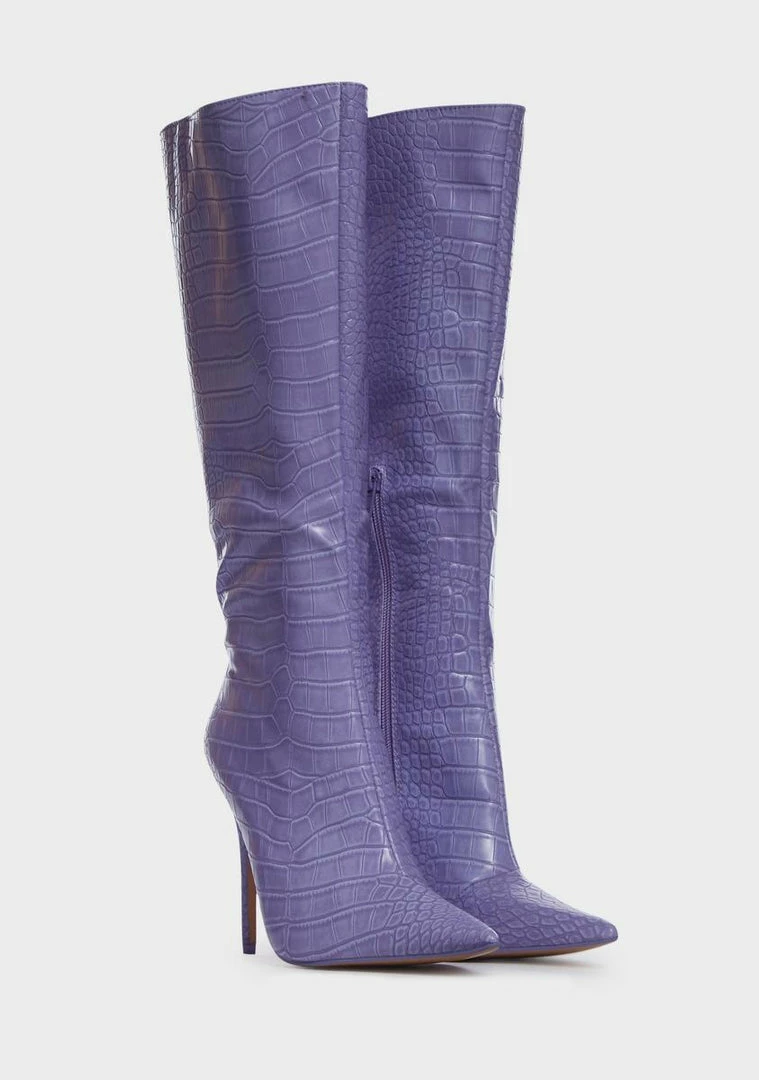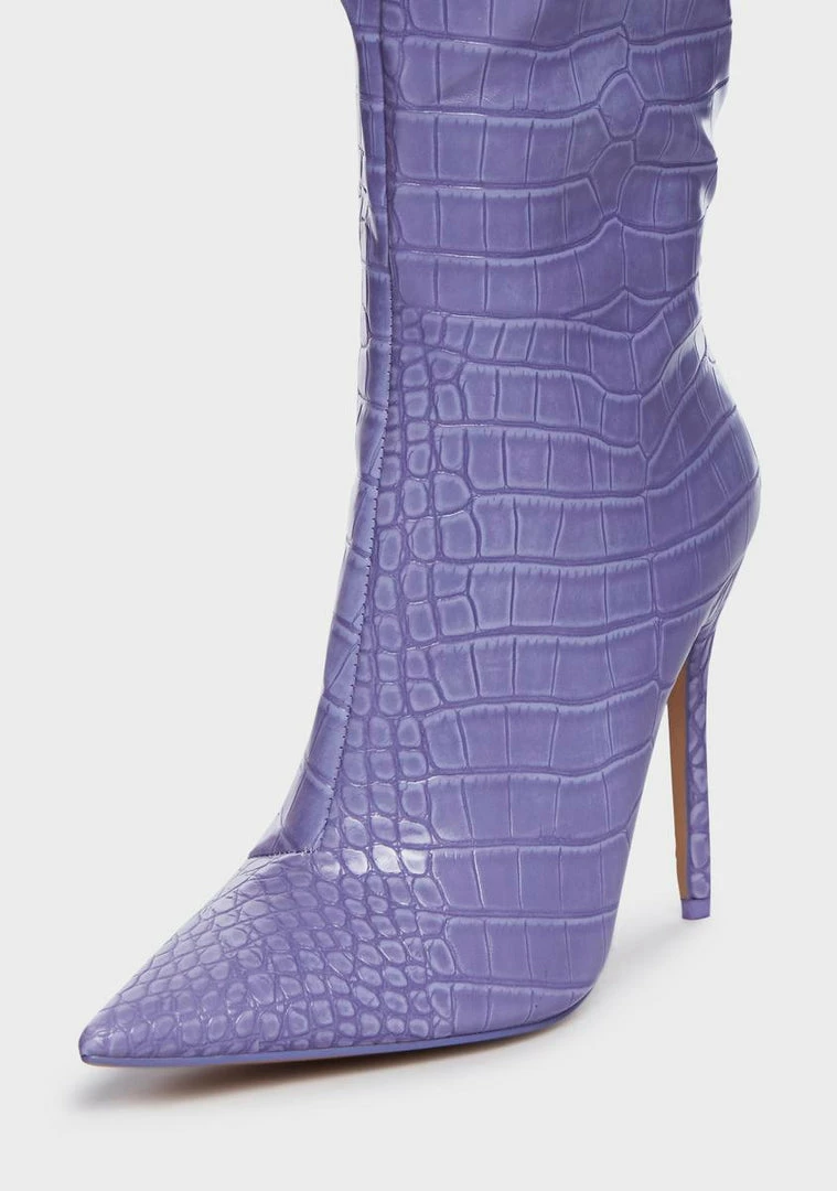 cuz you won’t settle for second best. These boots come in a vegan leather croc construction, with a pointed toe, stiletto heel, and inner zip closure.