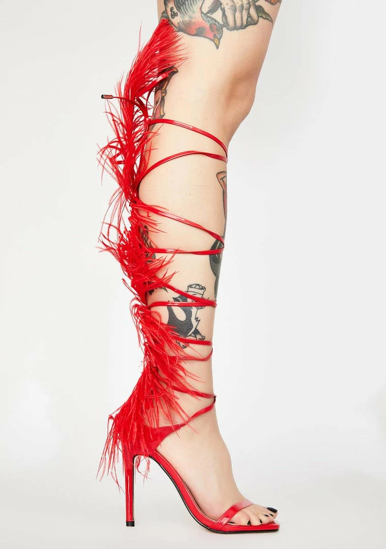 ya asked for a statement shoe? You got it, bb. YouΓ’ΒΒre the highlight of the night in these wrap heels that have a peep toe, stiletto heel, and lace up straps with a fluffy feather that runs up the calf.