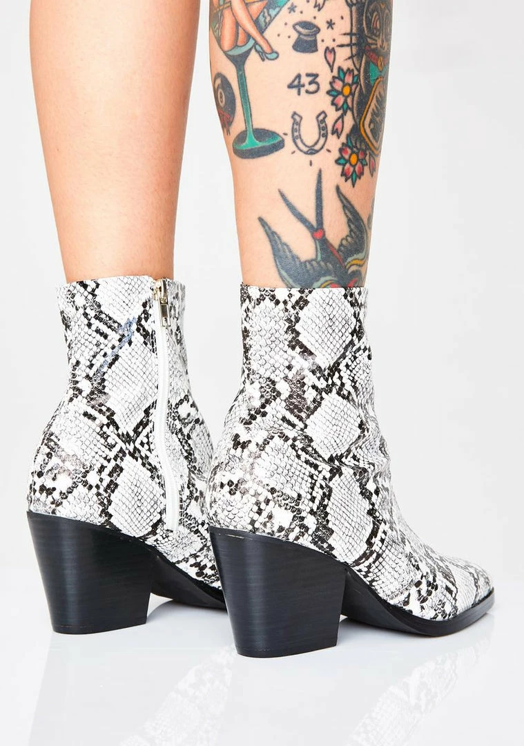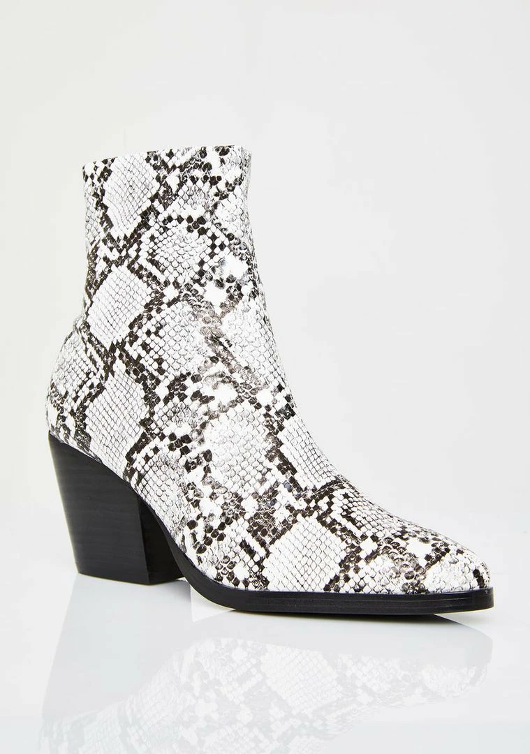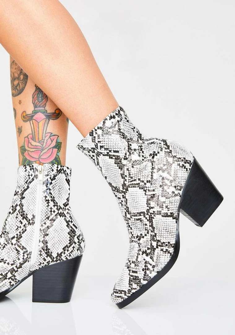 cuz youâre young, wild, Nâ free bb! Tell âem to hit the road in these dope snake boots that have pointed toes, chunky heels, Nâ side zip closures.
