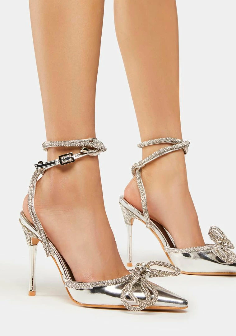 cuz you’re the life of the party! These mirrored vegan leather pointed toe heels feature diamante wrap straps with buckle closures, metallic stiletto heels, and diamante bows on the toes.