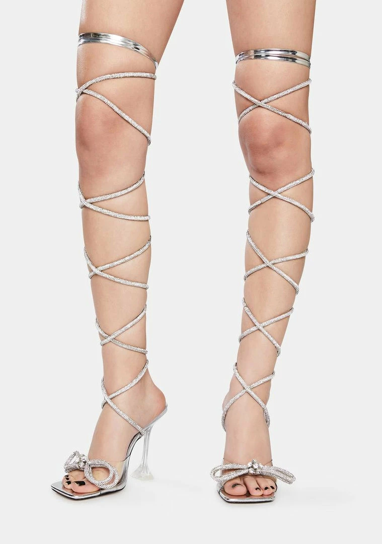 you deserve a crown! These wrap heels have clear toe straps with diamante bow details, clear heels, and wrap gladiator straps.