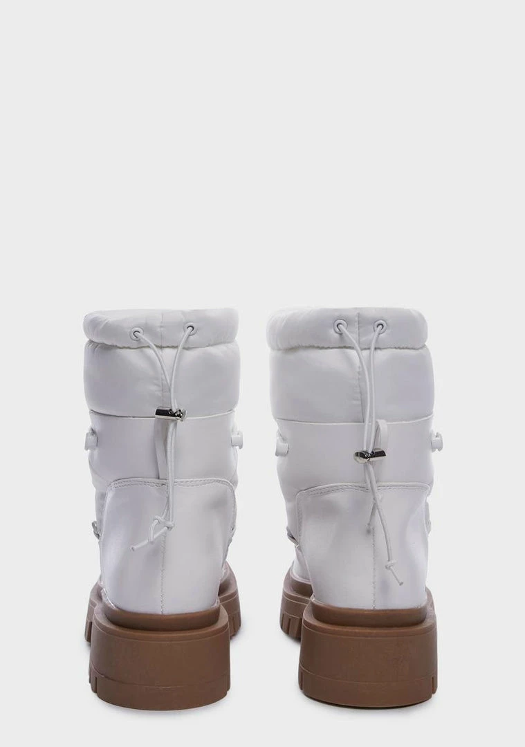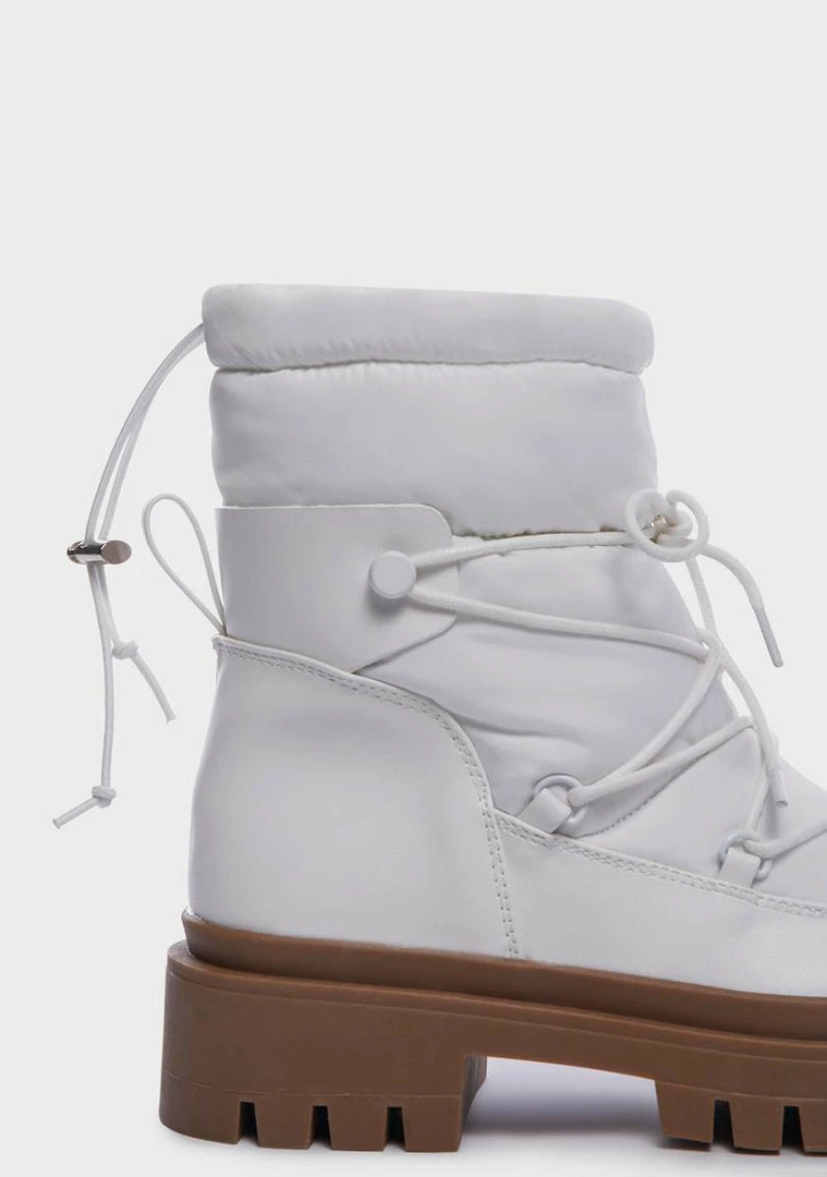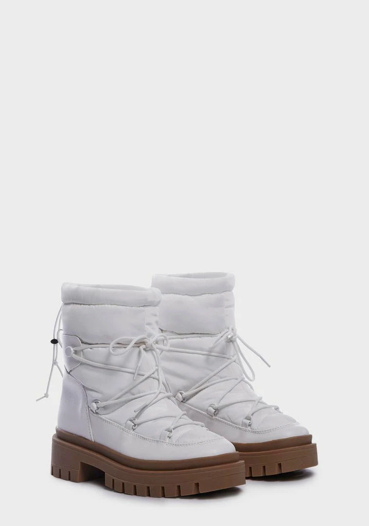 cuz winter is on its way! These ankle snow boots have a vegan leather construction, puffed shafts with drawstring cords, lace-up ties at front, and low platforms and block heels.