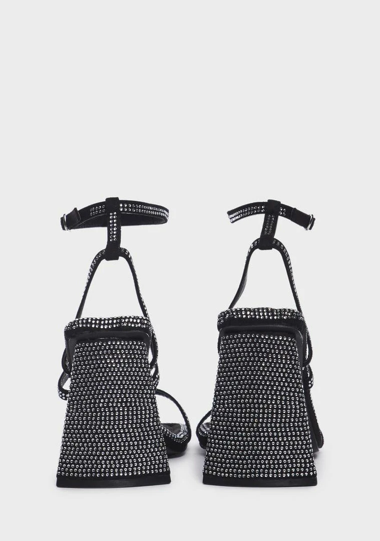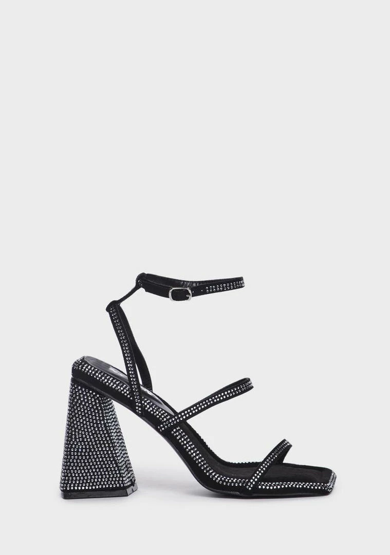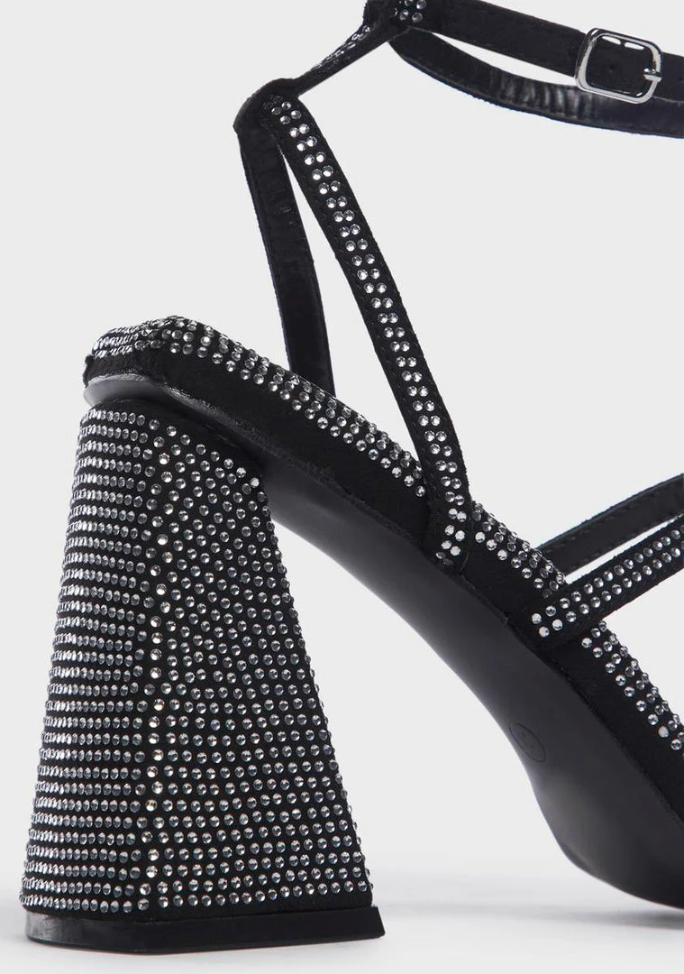 cuz you know how to leave an impression. These shoes come with a shaped heel, foot straps, an ankle buckle strap closure, and rhinestone details all over.