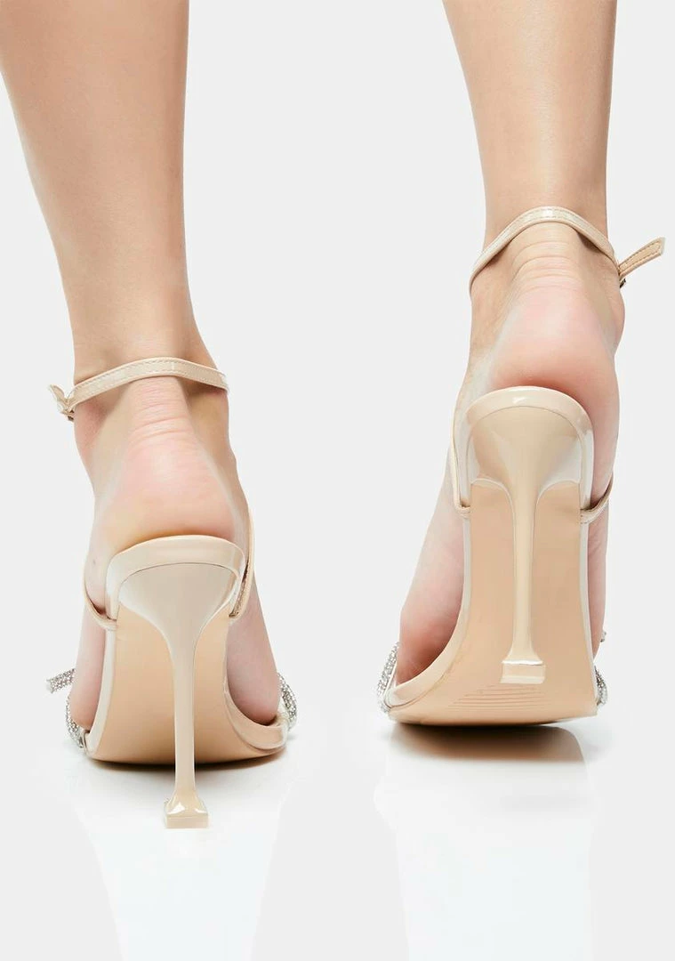 cuz you’re here to party. These heels have a patent vegan leather construction, a clear toe strap, a rhinestone-embellished knotted toe strap, adjustable wraparound ankle straps with buckle closures, a flared stiletto heel, and an open square toe.