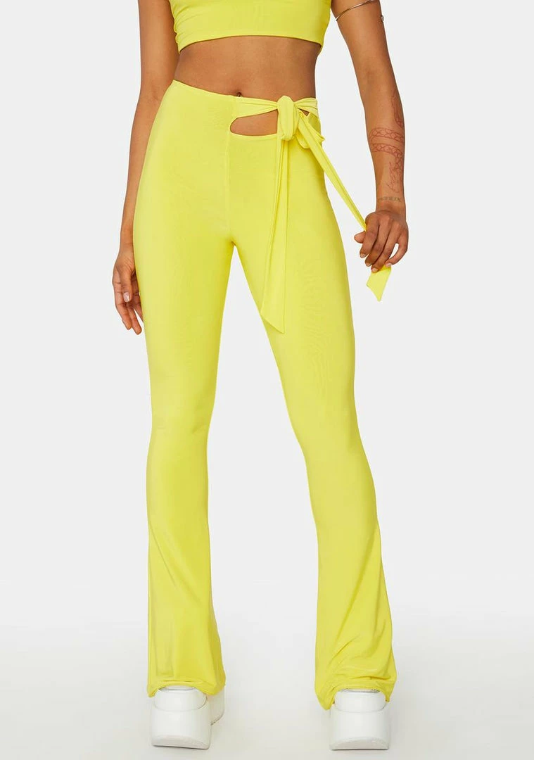 cuz you’re anything but basic. These high-waisted pants have a stretchy construction, a waist cutout with adjustable ties, and flared legs.