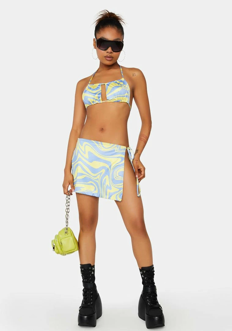 cuz you’re too hot to handle. This cropped bandeau top has a psychedelic wavy print all over, a front cutout, adjustable ruched bust cups, and a self-tie halter neckline and back.