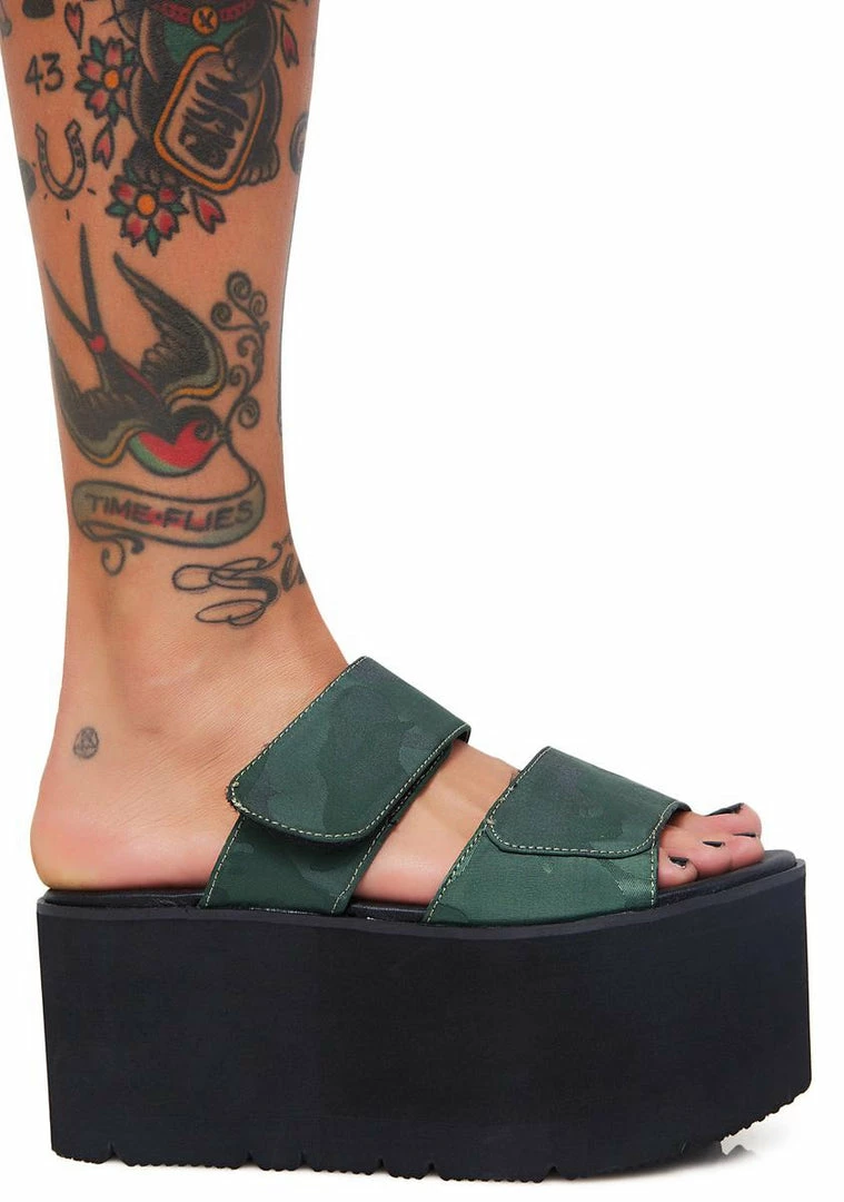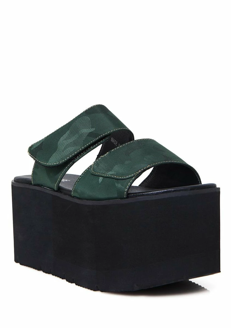 will have you feelinΓ’ΒΒ sporty chic. These platform sandals have a camo print design and chunky velcro straps to keep Γ’ΒΒem on ya.