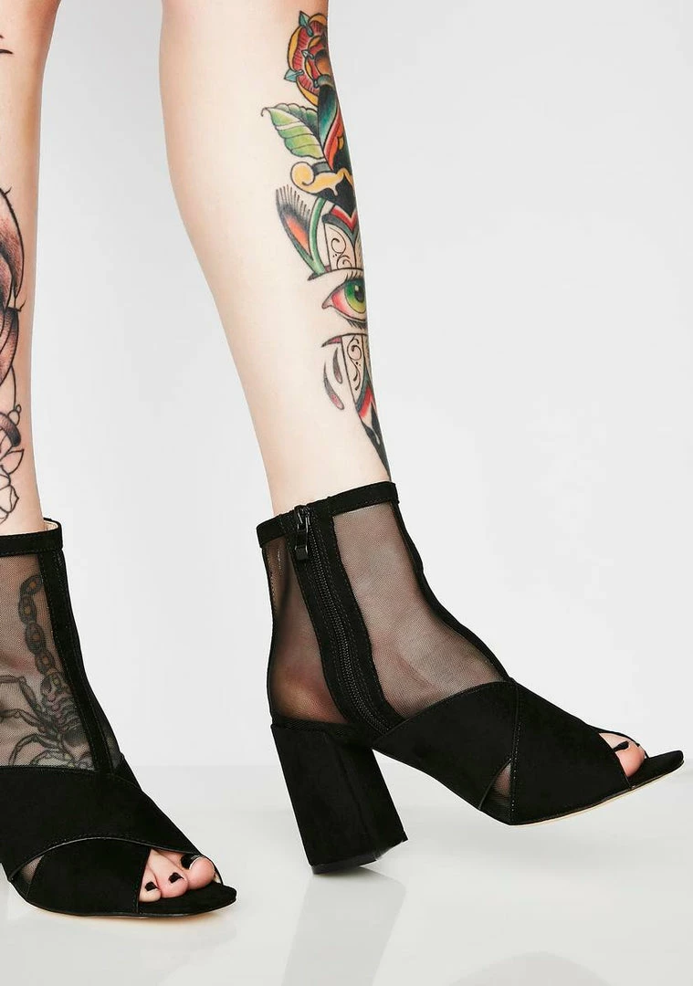 cuz you strut it like you own it. Keep emâ mesmerized with these mesh ankle boots that have peep toes, crossover straps on the front and zip closures.