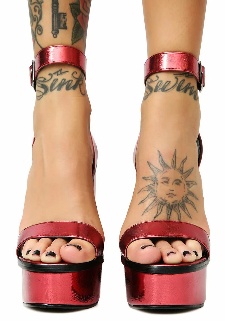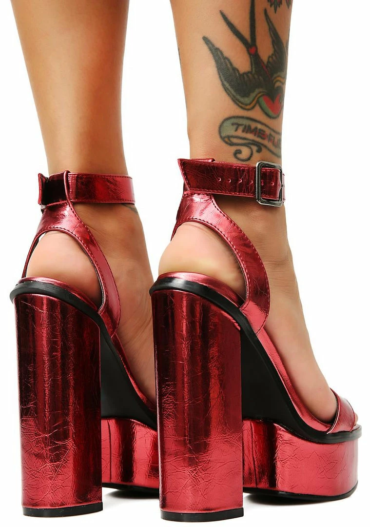 will take ya higher. These sikk af metallic heels have thikk platforms and an adjustable ankle strap.