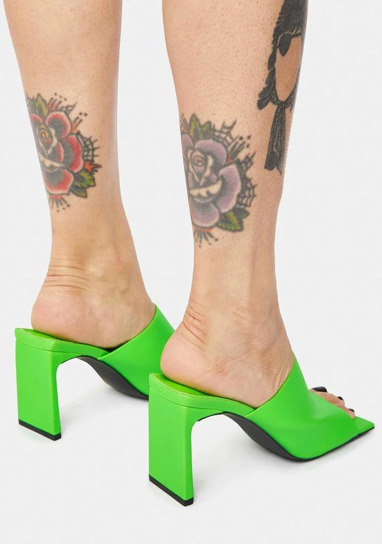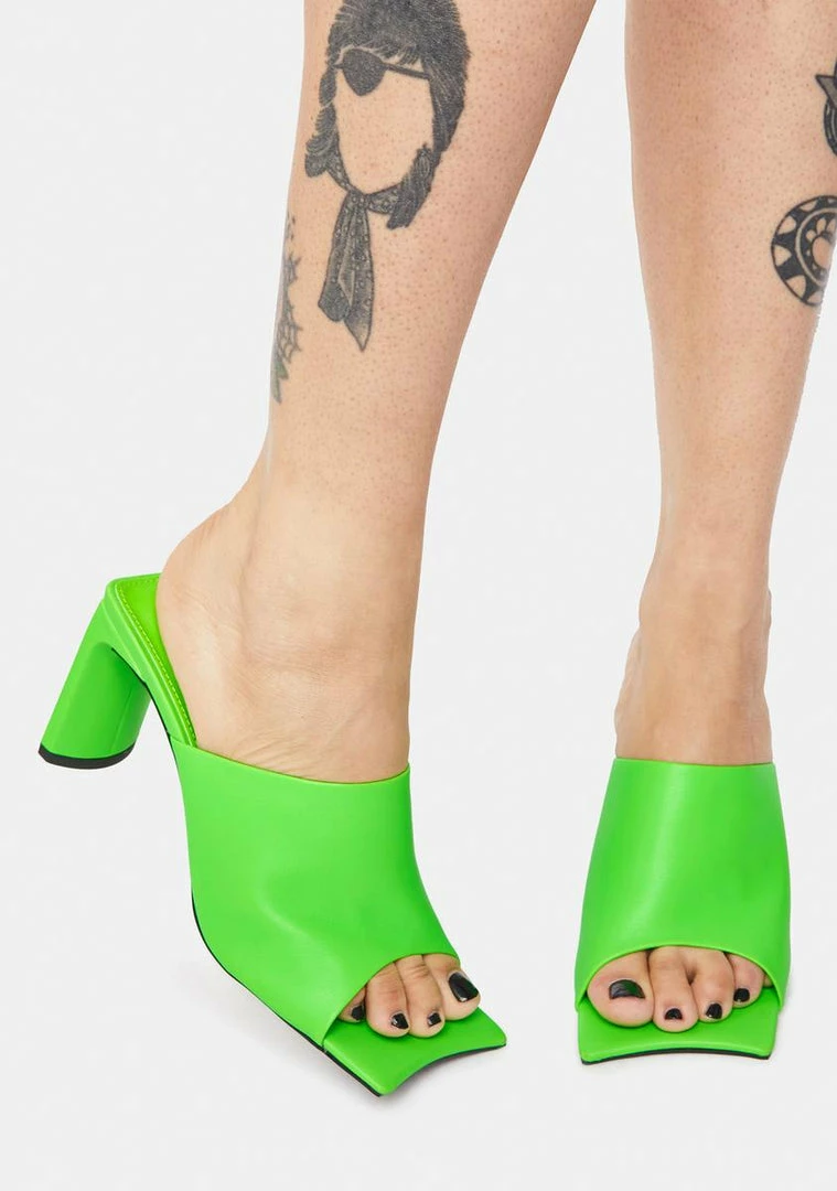 feature a neon fabric design, chunky kitten heel, and square peep toe construction.