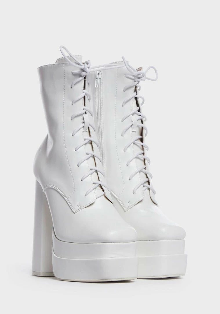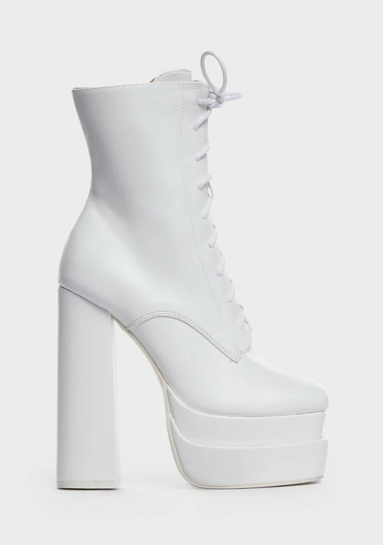 cuz stayin’ grounded is overrated. These boots have a vegan leather construction, platform soles, block heels, front lace ups, and side zipper closures.