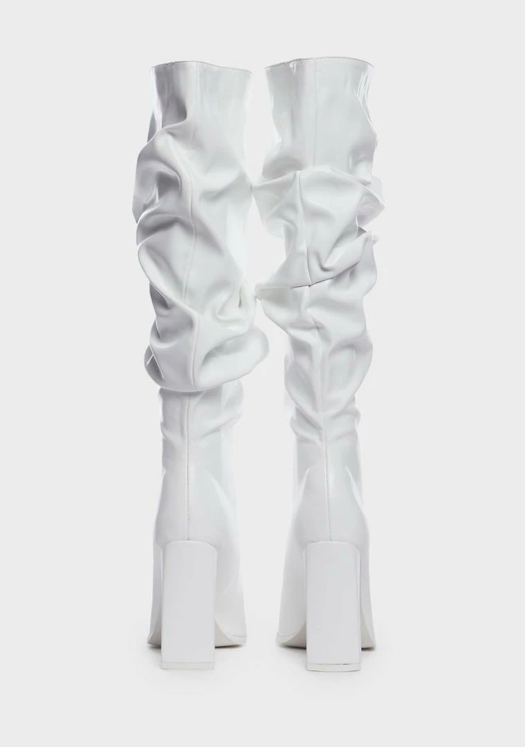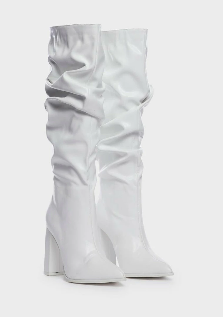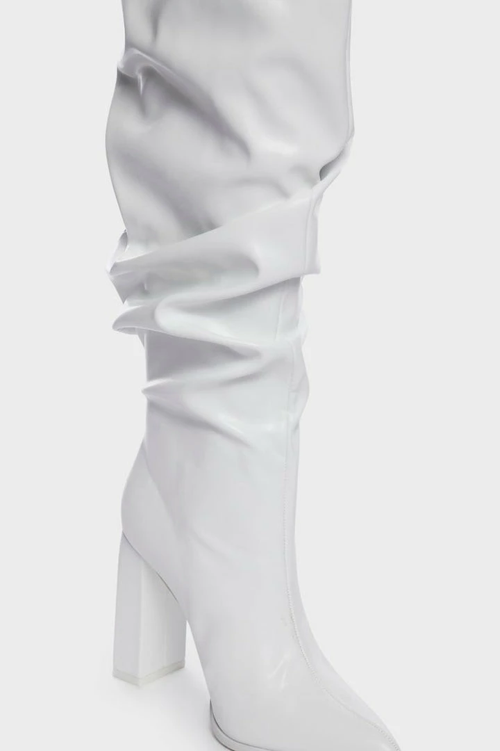 cuz double down. These boots have a vegan leather construction, a slouchy design, pointed toes, block heels, and a pull on fit.