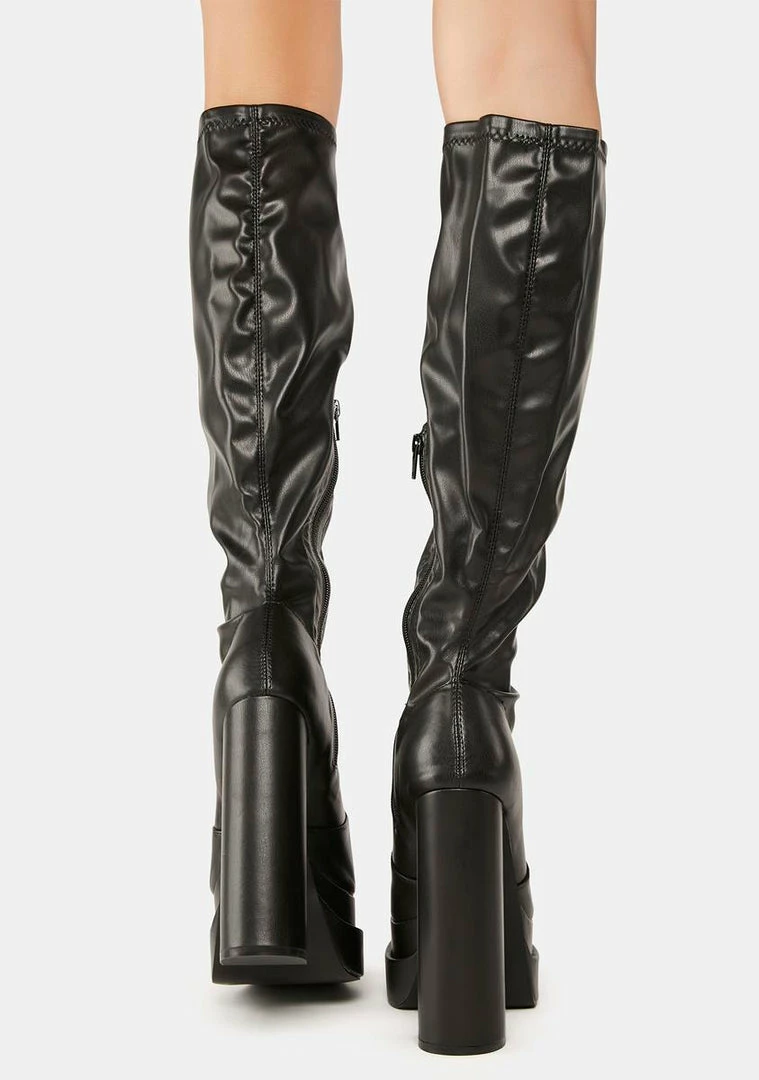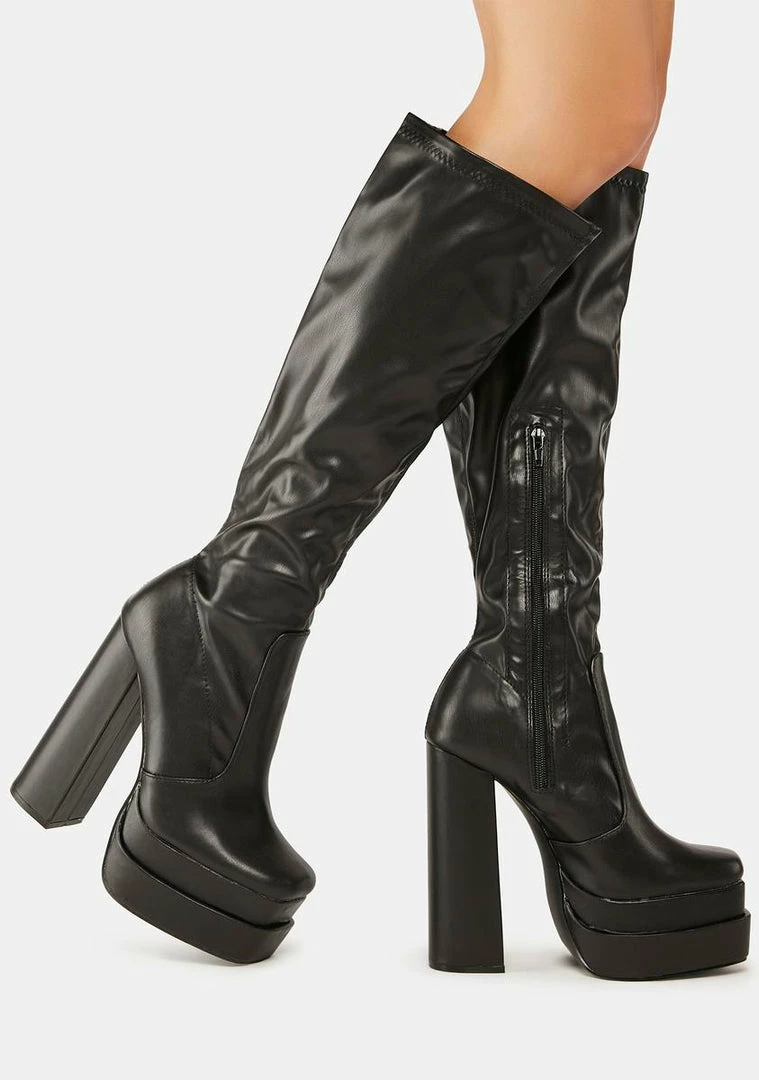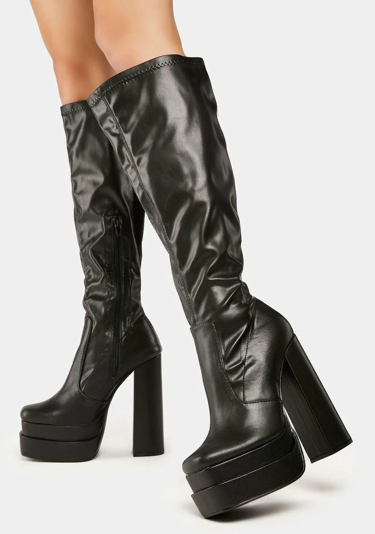 cuz you’re on another level. These wide width/wide calf boots have a vegan leather construction, knee-high shafts, double-stacked platforms, square toes, inner zip closures, and block heels.