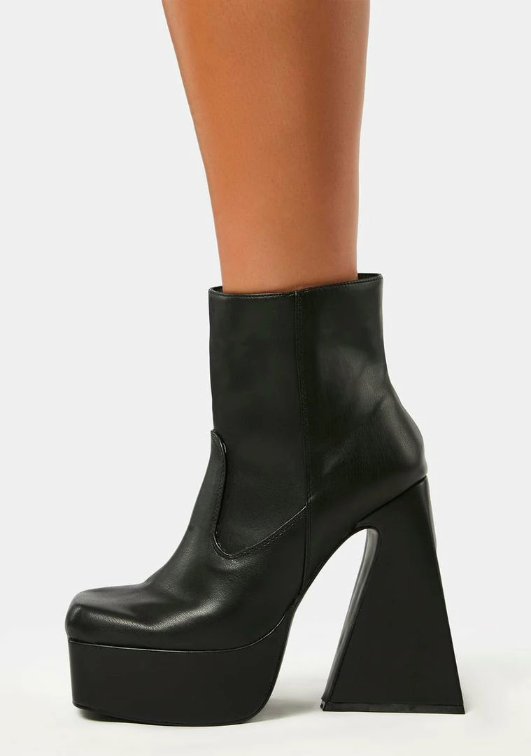 stop scrolling. These platform ankle boots have a wide fit, a vegan leather construction, square toes, side zip closures, and flared block heels.