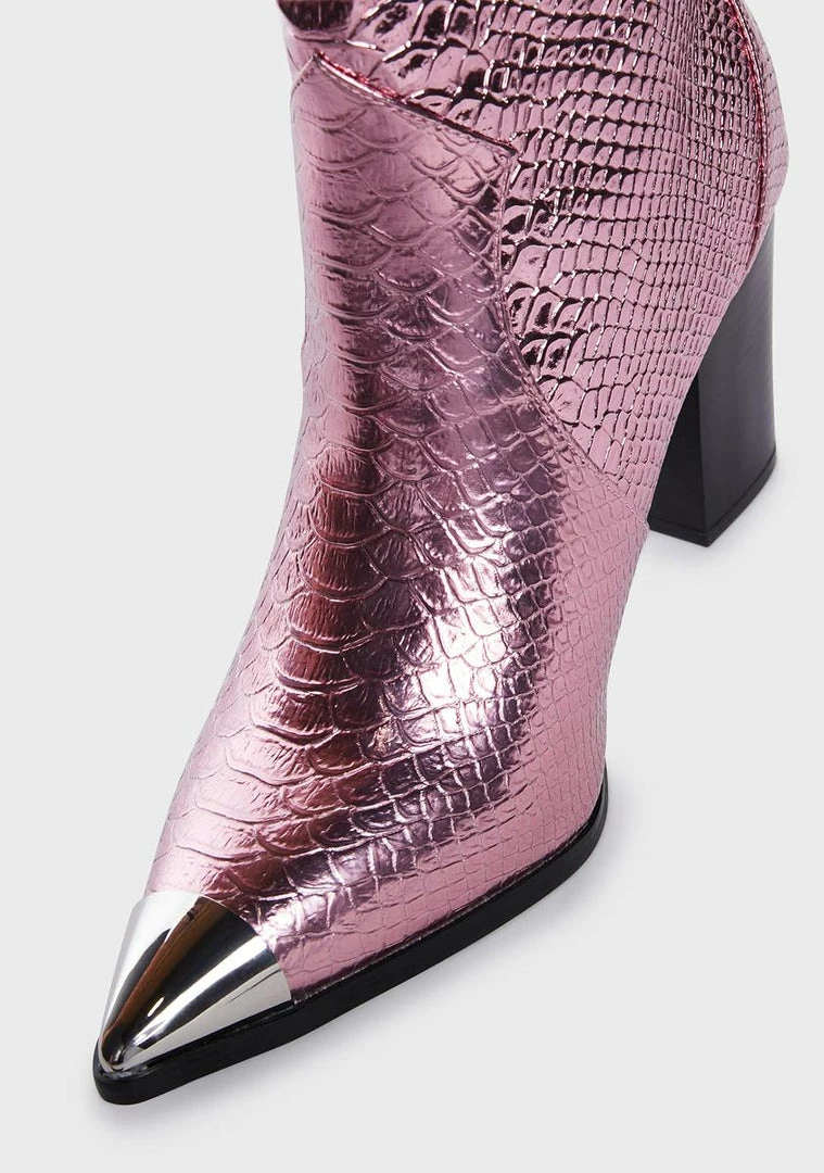 cuz you’re no basic babe. These wide width/wide calf cowboy boots have a vegan leather construction, a metallic finish with faux snakeskin texture, covered pointed toes, and block heels.