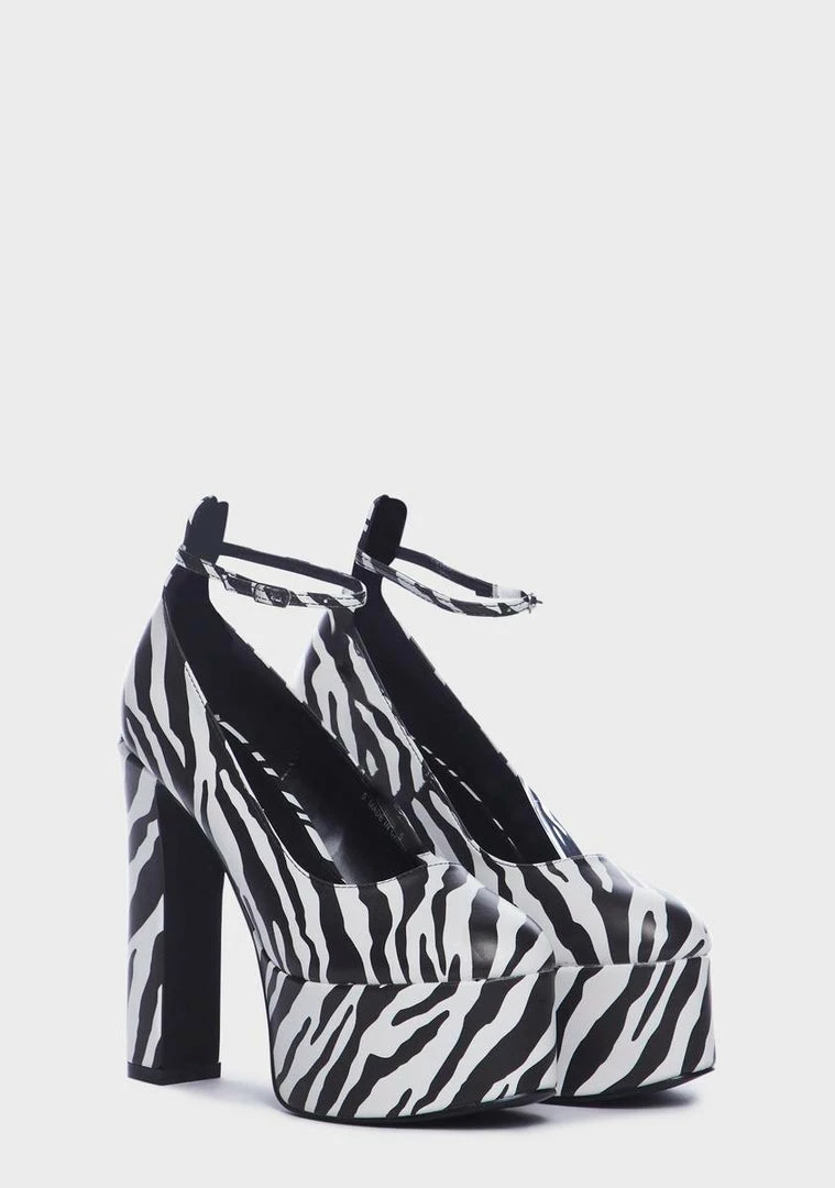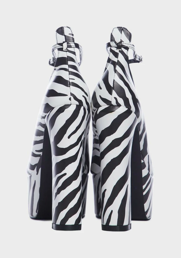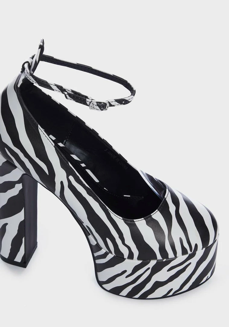 cuz you make everything better. These platform heels have a vegan leather construction, a zebra print all over, adjustable buckled ankle straps, and tall block heels.
